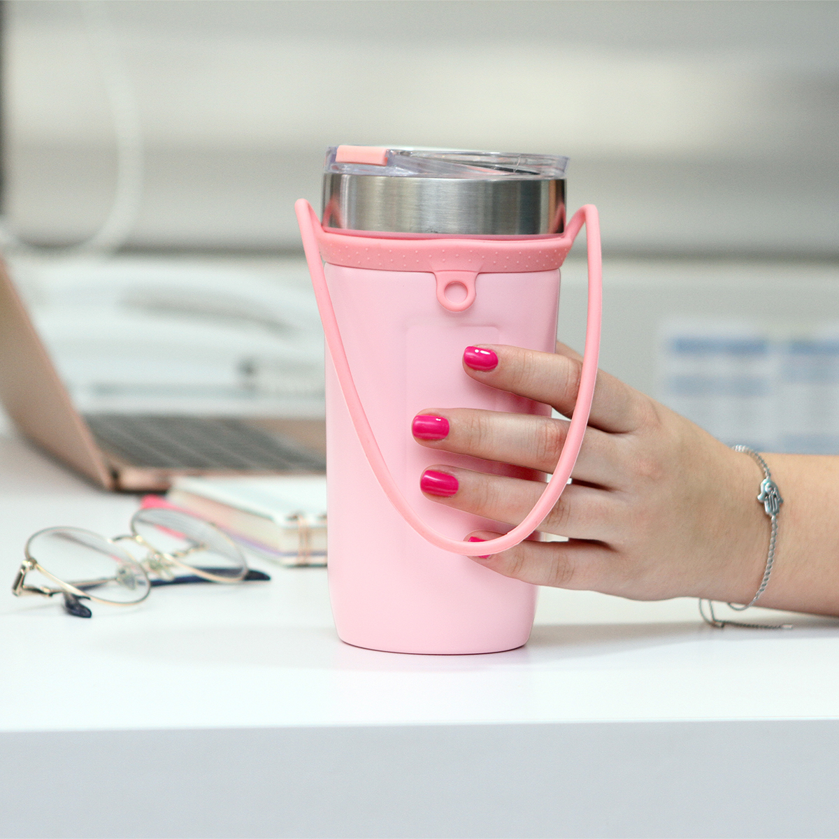 Termo Cariati. - Termo fabricado con doble pared de acero inoxidable, asa de silicona y tapa deslizable antiderrames. El asa de silicona es ideal para llevar tus bebidas a todos lados sin la preocupación de sufrir derrames. Capacidad de 480 ml.