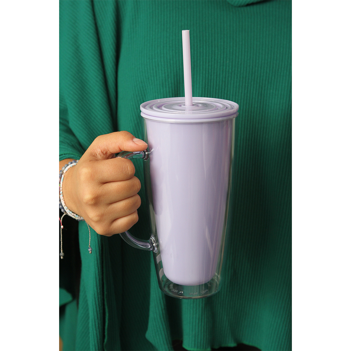 Vaso Ange. - Vaso doble pared; pared interna de color y externa transparente fabricado en acrilonitrilo estireno (AS) y tapa fabricada en polipropileno (PP). Capacidad de 24 onzas (720 ml). Cuenta con agarradera y popote.