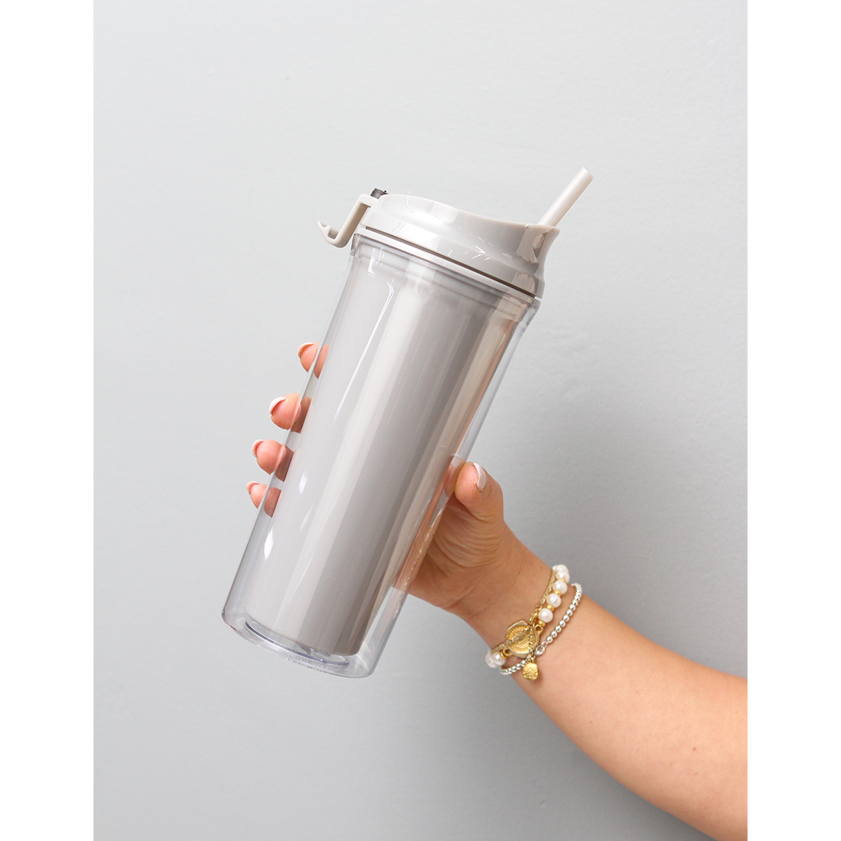 Botella Bracke. - Botella doble pared; pared interna de color y externa transparente, fabricado en acrilonitrilo estireno (AS). Incluye popote fabricado en poliestireno (PS). El diseño de la tapa también ayuda a beber directo de la boquilla . Capacidad de 690 ml.