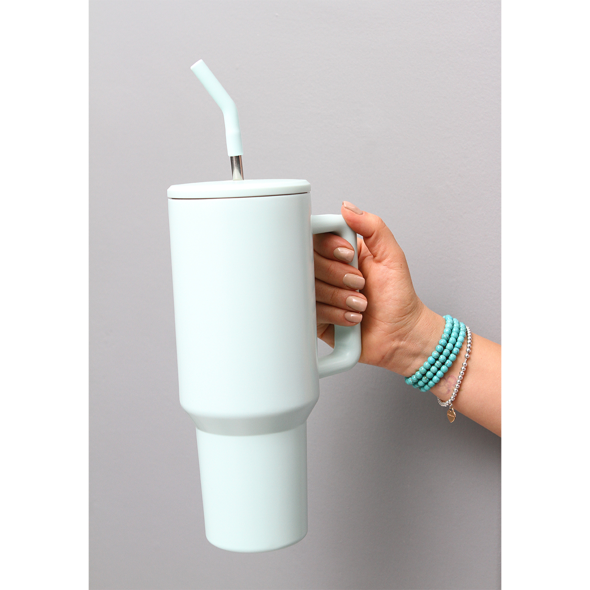 Termo Arans. - Termo fabricado en acero inoxidable de doble pared, tapa con entrada hermética para popote. Capacidad de 1,200 ml. Incluye agarradera y popote con boquilla de silicón.