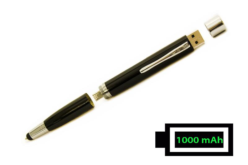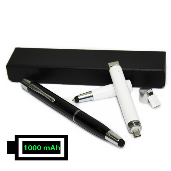 POWER BANK BOLÍGRAFO INCLUYE ESTUCHE Power Bank Bolígrafo de tinta negra con Punta Touch para dispositivos táctiles. Capacidad de 1000 mAh. Incluye Estuche de cartón negro de 18 cm x 4 cm x 2.5 cm y Convertidor de conector Android a iOS.