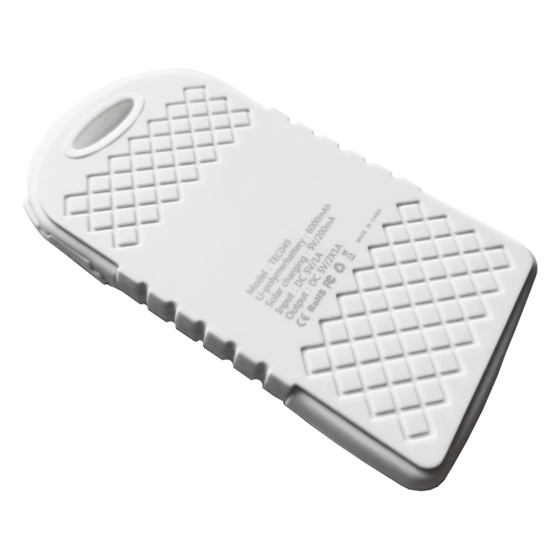 POWER BANK SOLAR Power Bank con Celdas Solares, cuenta con lámpara LED y dos puertos USB que permite cargar 2 equipos simultáneamente. Capacidad de 6,000 mAh en batería y recarga solar de 5v/200 mAh. Incluye cable USB para Android.