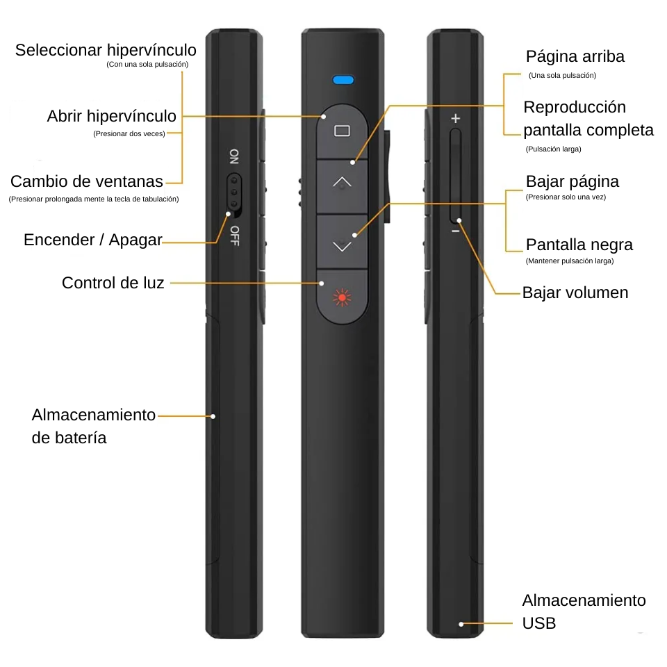 PRESENTADOR INALÁMBRICO USB LÁSER RECARGABLE El presentador de diapositivas admite hipervínculo, control de volumen, cambiar de ventana, pantalla completa o negra, página arriba/abajo. Fácil de usar, no es necesario descargar software, simplemente enchufar y usar. El diseño de botones de silicona hace que su pulgar se sienta cómodo. El indicador LED de baja potencia parpadeará cuando la energía comience a agotarse. Diseño de una sola pieza, el mini receptor USB se almacena en la cola del presentador con un sistema magnético. Compatible con Windows 10, Mac OS, Linux y Android. El presentador está optimizado para trabajar con software como: PowerPoint, Google Slides, iWork (Keynote & Numbers & Pages), Prezi, PDF, MS Word, Excel, ACD See y sitios web.