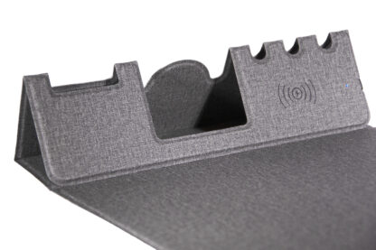 Mouse pad multifuncional con carga inalámbrica: plegable e impermeable, cuenta con soporte para tarjetas y teléfono, bandeja para bolígrafos, interfaz de carga y superficie de precisión para el mouse.