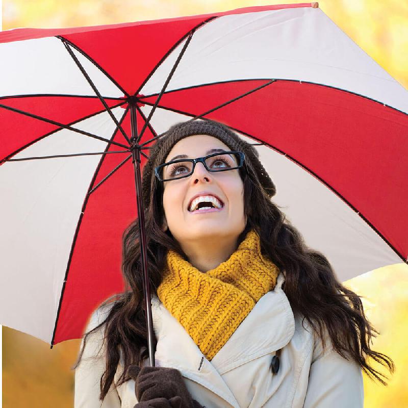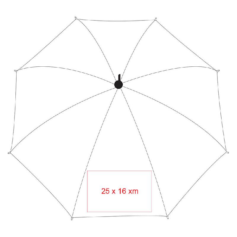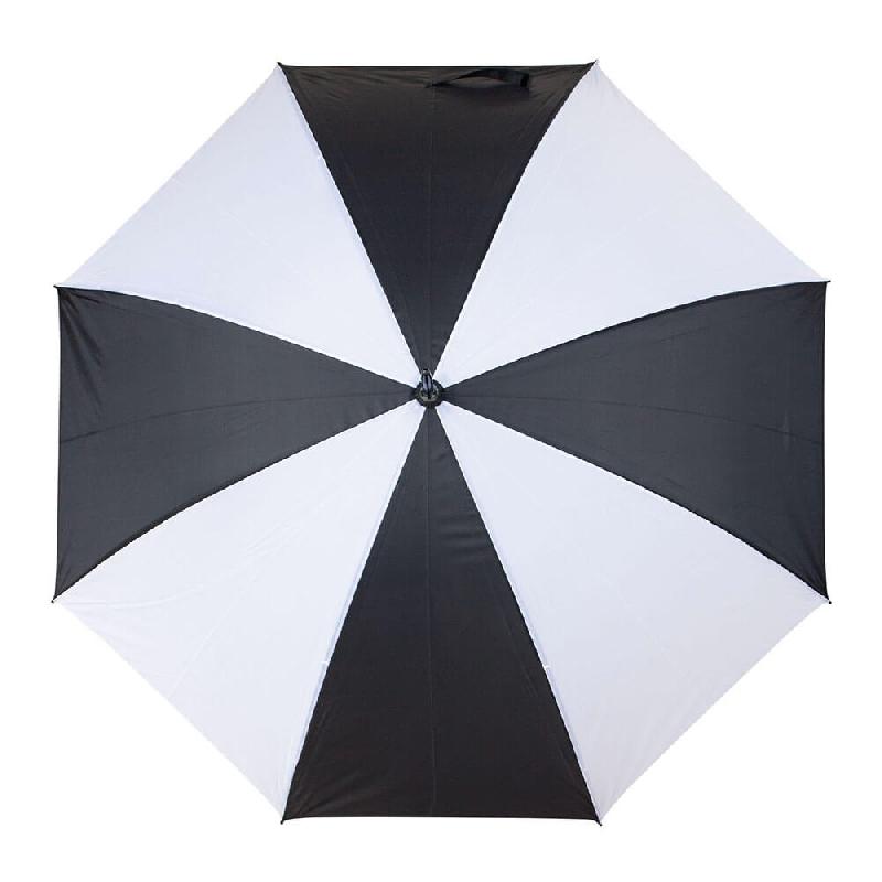 Paraguas bicolor de 8 gajos. Medidas: 100 x 152 cm Material: Poliéster y acero. Empaque: Bolsa de celofán.