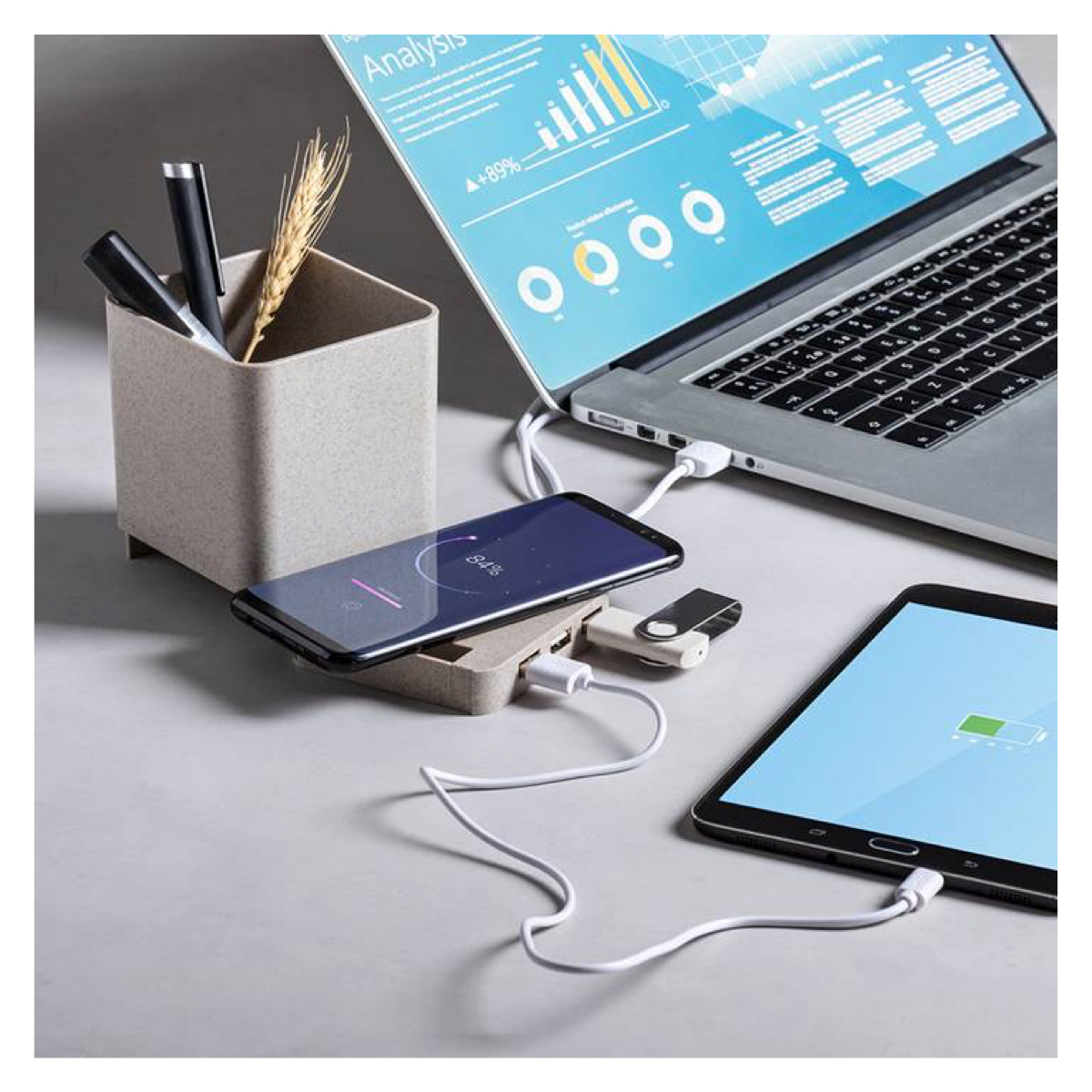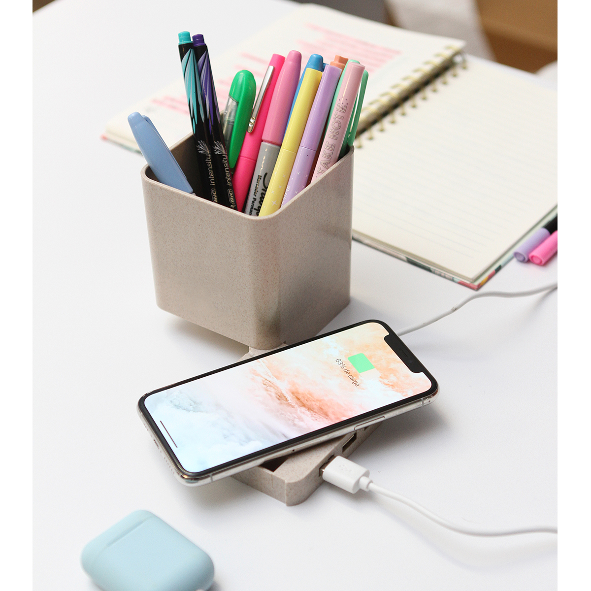 Porta lápices Rivne. - Porta lápices fabricado en fibra de trigo y plástico ABS, con cargador inalámbrico para dispositivos móviles de 5W y 3 salidas USB, de tamaño compacto lo que lo hace fácil de transportar. Carga a través de cable USB (incluido). Incluye caja de cartón individual.