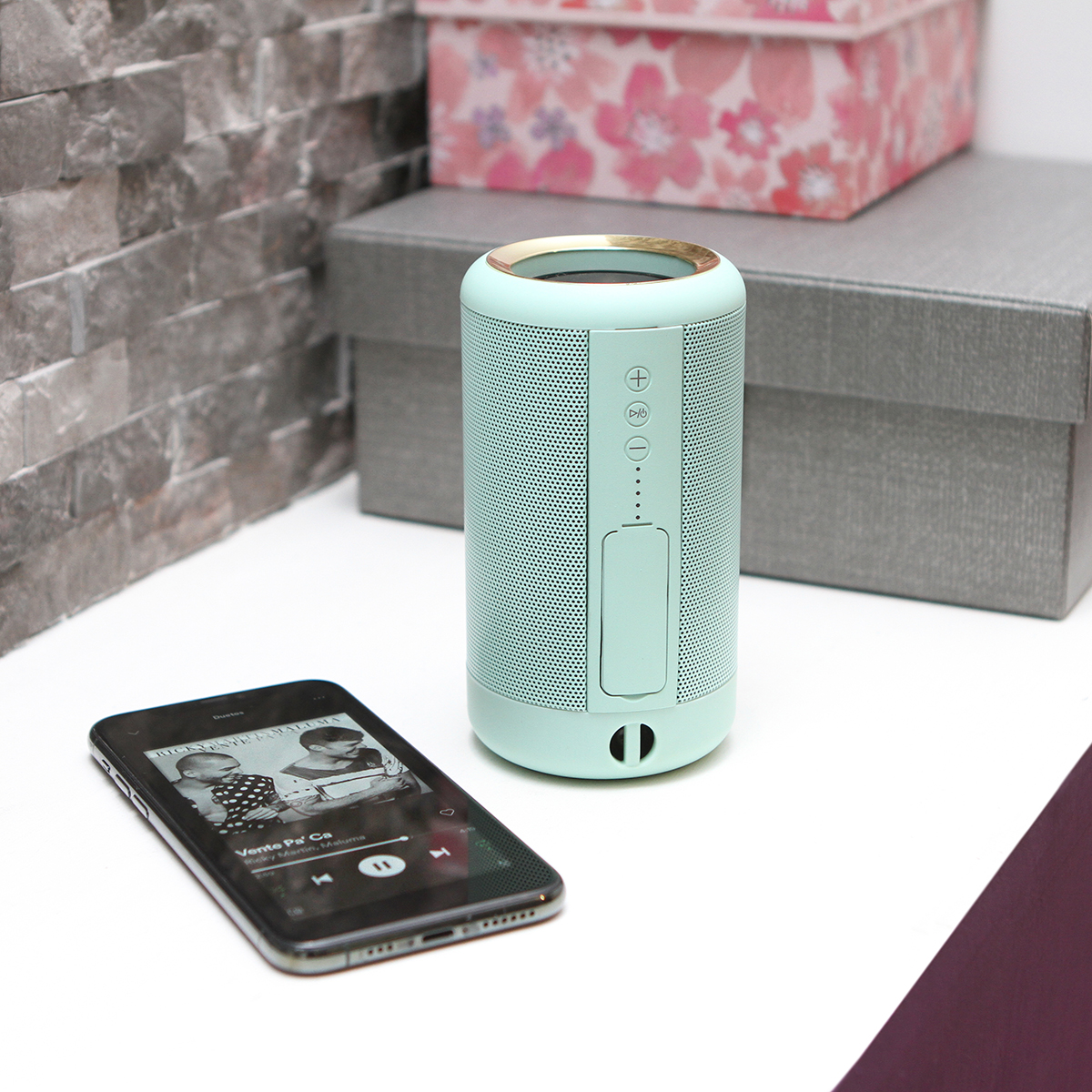 Bocina Rieti - Bocina con conexión de sonido sin cables,  power bank con capacidad de 1,200 mAh, batería integrada de iones de litio, fabricada en plástico ABS con acabado rubber (suave), con un detalle color dorado en la parte superior, con entrada protegida.
