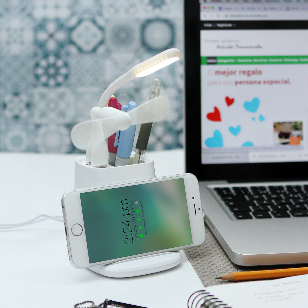 Porta lápices Embu. - Porta lápices multifuncional fabricado en plástico ABS, con cargador inalámbrico tecnología WPC Qi v1.2.4, soporte de silicon para teléfono celular, dos puertos usb, ventilador, lámpara led y entrada de carga tipo C. Incluye caja de cartón individual.