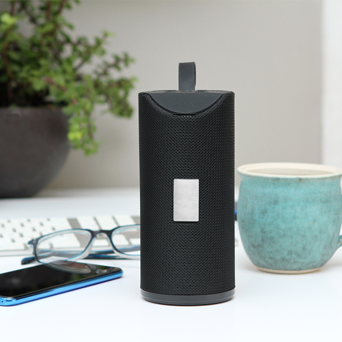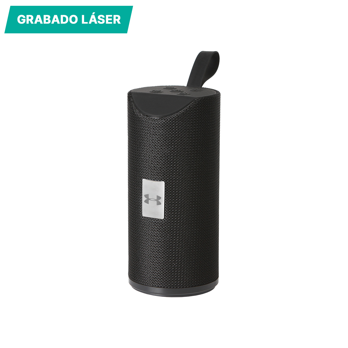 Bocina Ukunda. - Bocina con conexión de sonido sin cables, asa en la parte superior, con una placa en la parte frontal para grabar, botones en la parte superior, carga a través de cable USB (incluido), cable auxiliar para audio y caja individual de cartón.
