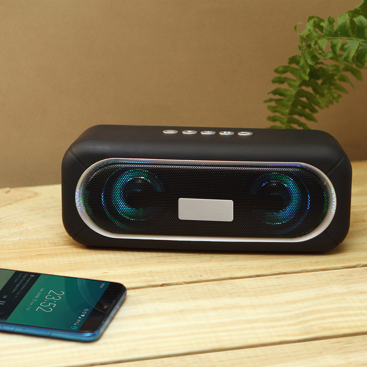 Bocina Malang. - Bocina con conexión de sonido sin cables fabricada en plástico, con radio FM, con 2 altavoces, 6W de potencia, entrada para USB, con función de manos libres, batería integrada de iones de litio con capacidad de 1,200 mAh, cable de audio de 3,5 a 3,5 mm y ranura para tarjeta TF. Incluye cable de carga USB a micro USB y caja de cartón individual.