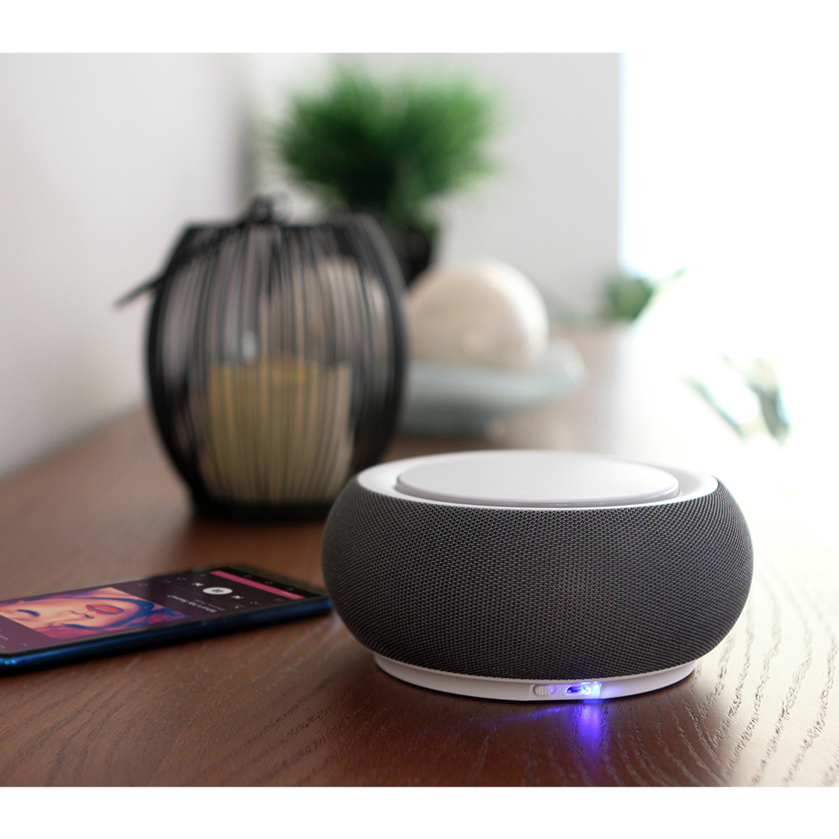 Bocina Migori. - Bocina con conexión de sonido sin cables, cargador inalámbrico y luz led; carga a través de cable usb (incluido). Incluye caja individual de cartón.