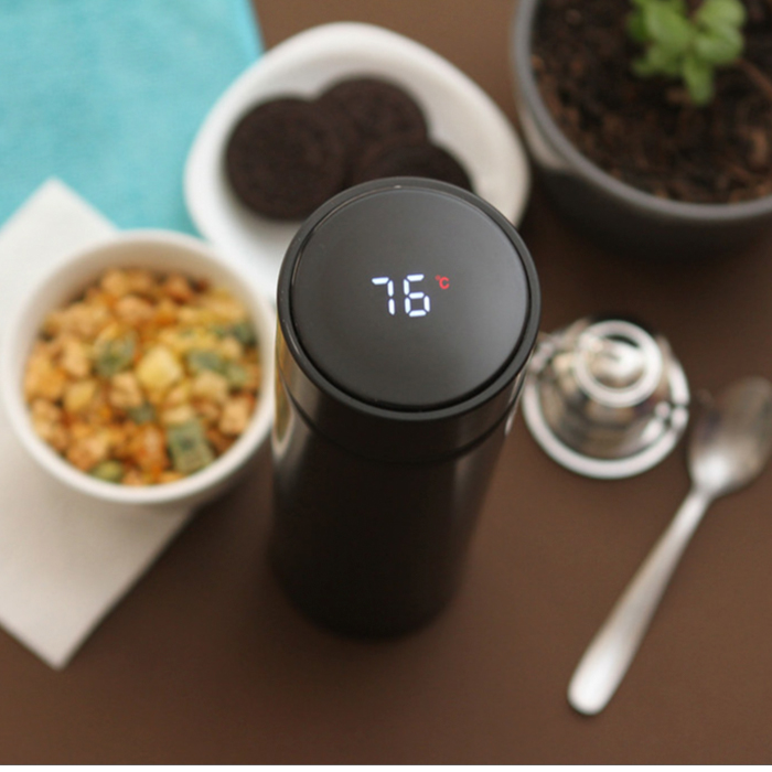 Termo con termómetro. - Termo inteligente de acero inoxidable doble pared; con pantalla LED indicadora de temperatura interior en la tapa. Fabricado en materiales de grado alimenticio, mantiene bebidas frías o calientes por un largo tiempo. La batería dura hasta 2 años. No usar en microondas. Capacidad de 500 ml. Incluye caja de cartón individual.