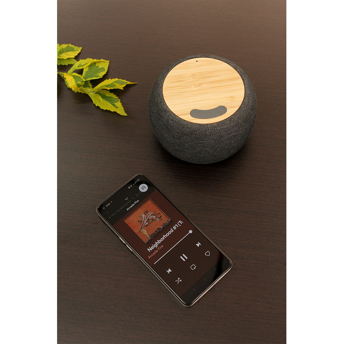 Bocina Shamal. - Bocina con conexión de sonido sin cables, forrada en tela la cual proporciona una protección adicional contra golpes y arañazos, la parte superior de la bocina está hecha de bambú que es conocido por su durabilidad y resistencia, una de las características destacadas de la bocina Shamal es su capacidad de carga inalámbrica para dispositivos electrónicos, la bocina carga utilizando el cable USB el cual ya esta incluido. Incluye caja de cartón individual.