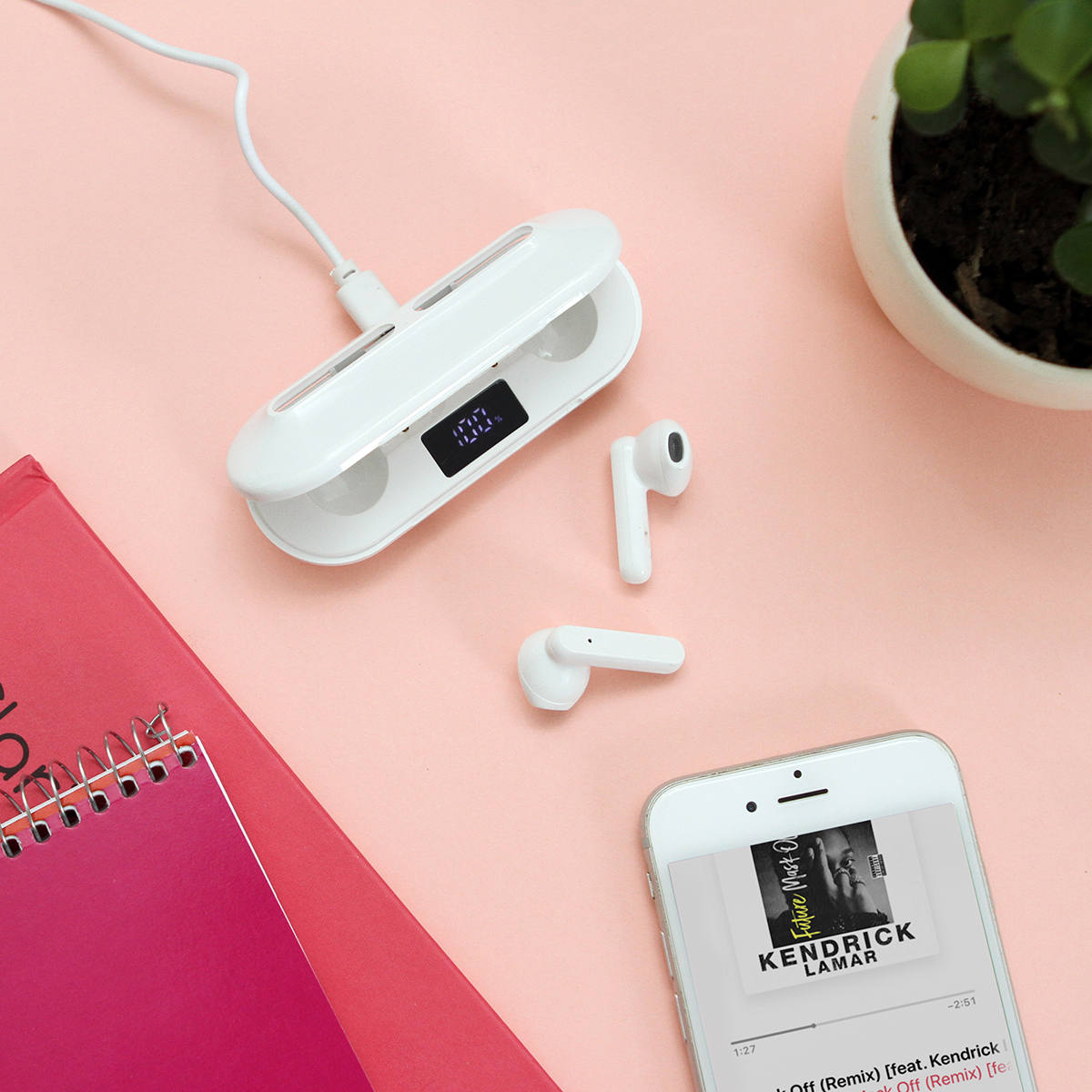 Audífonos Tulcea. - Audífonos con conexión de sonido sin cables con función touch, estuche de carga fabricado en plástico ABS, con pantalla en la parte interior donde se muestra el nivel de batería de los audífonos, tiempo de reproducción de música de 3 a 4 horas. Carga a través de cable USB (incluido). Incluye caja de cartón individual.
