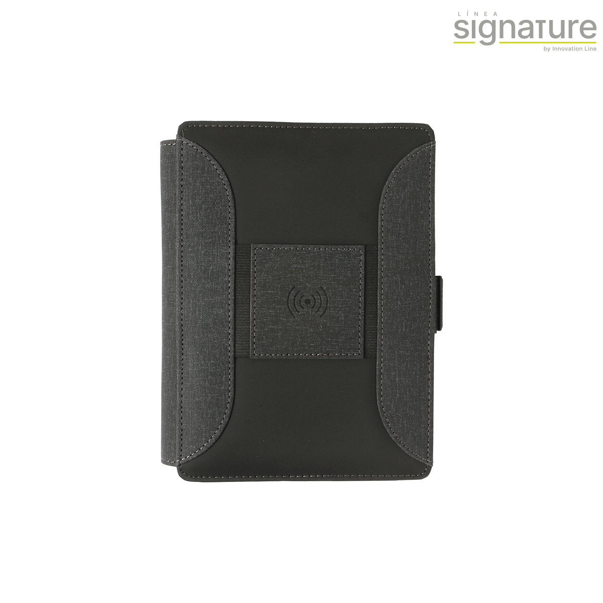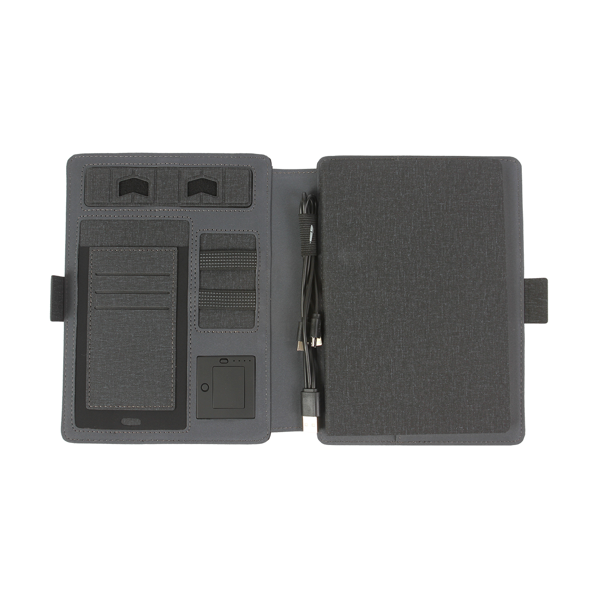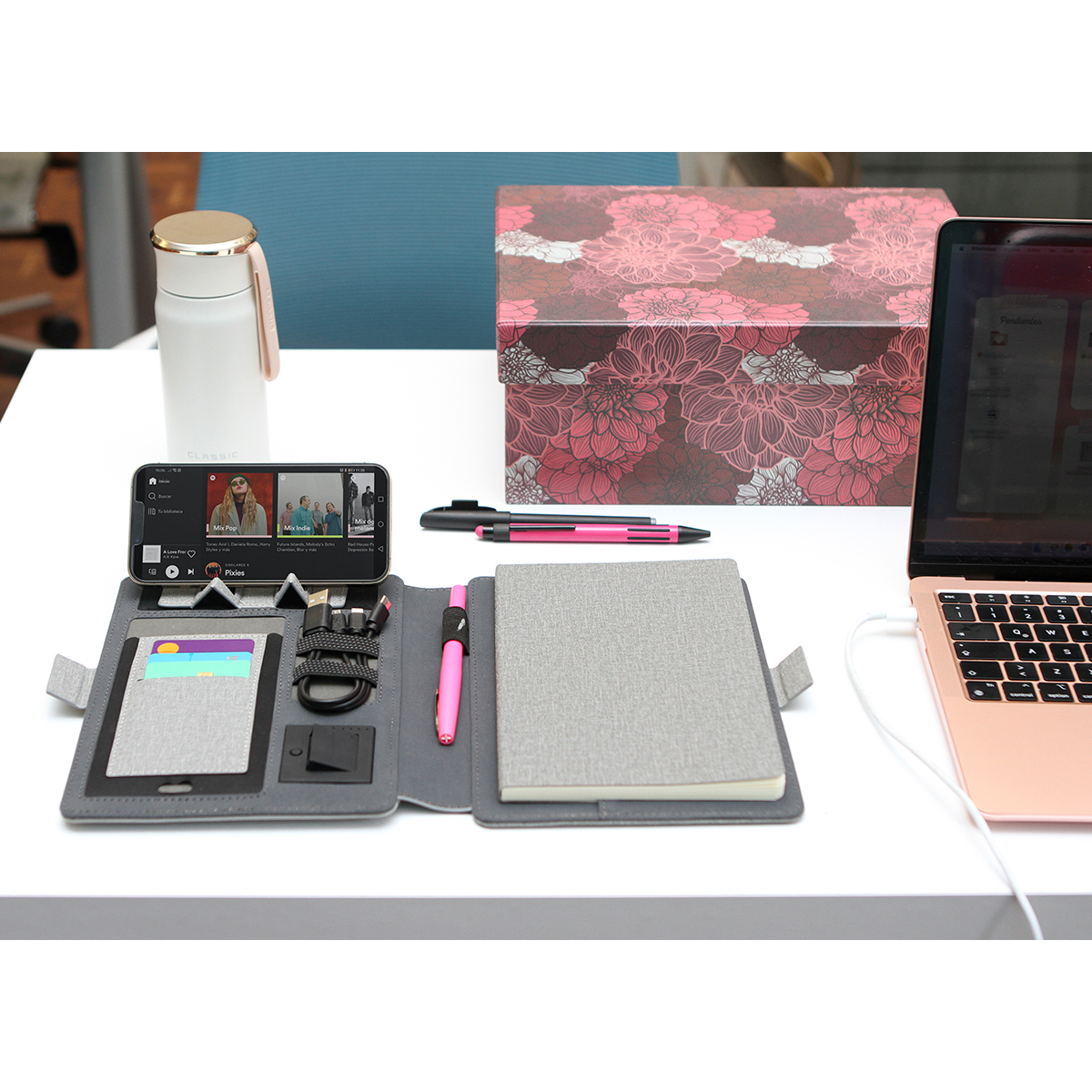 Carpeta Moron. - Carpeta con cargador inalámbrico y power bank de 6,000 mAh, con compartimentos para almacenaje, porta plumas y tarjetero, sujetadores de cables y base para teléfono móvil. Libreta con hojas rayadas y broches de seguridad.