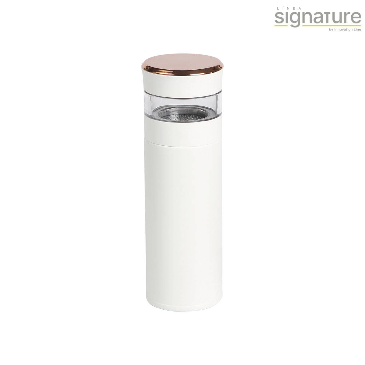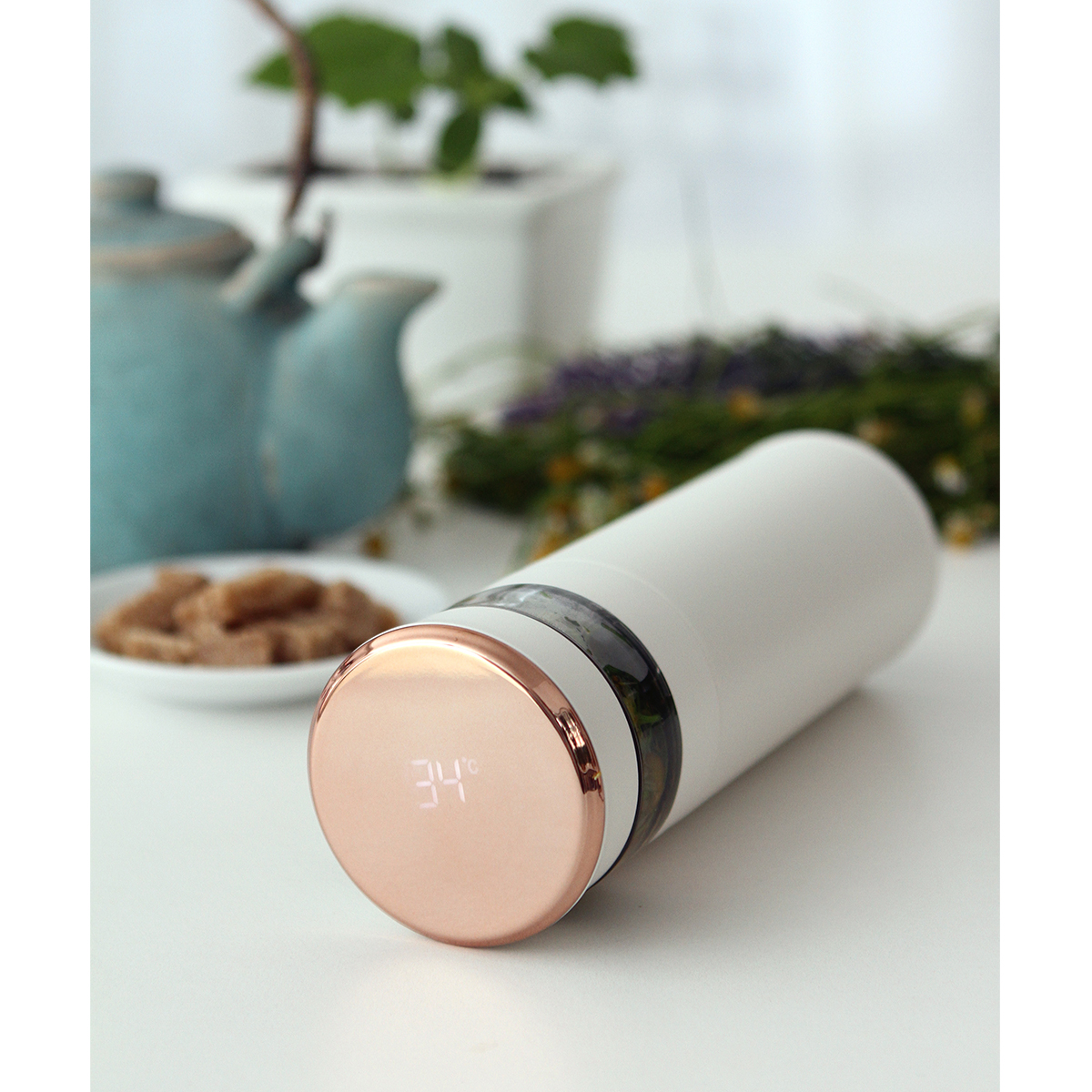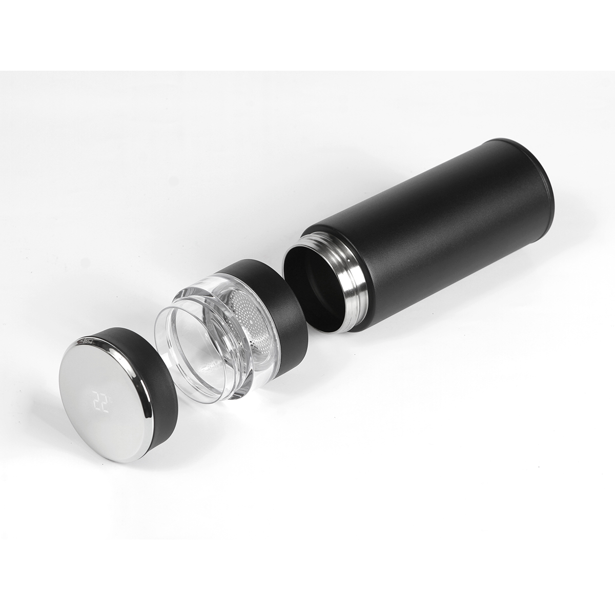 Termo Torretta. - Termo de acero inoxidable doble pared con display de temperatura en la tapa, sección para infusiones con rejilla coladora, fabricada en materiales de grado alimenticio, mantiene bebidas frías o calientes por un largo tiempo. No usar en microondas. Capacidad de 400 ml. Incluye caja de cartón individual.