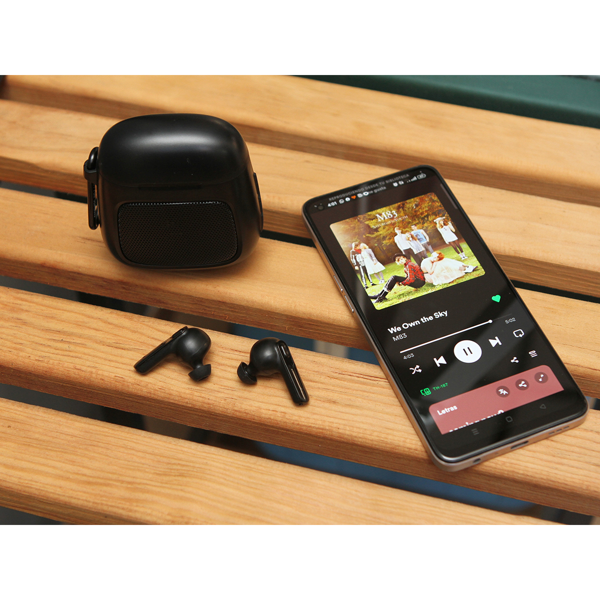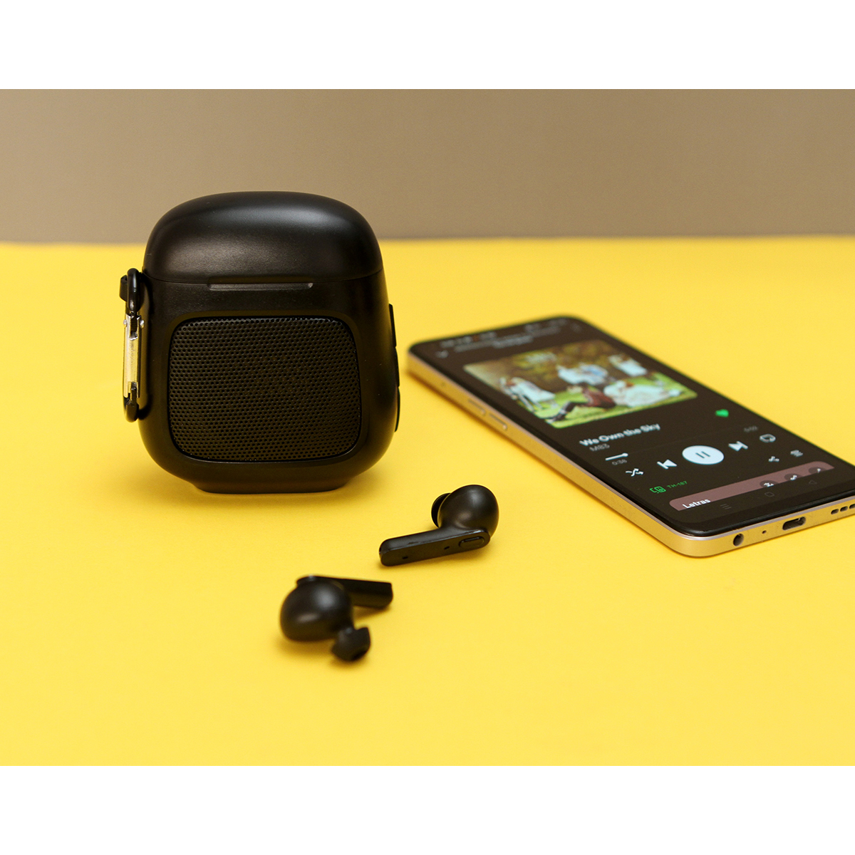 Bocina Bibbona. - Bocina con audífonos con conexión de sonido sin cables, fabricada en plástico, incluye arnés para fácil transporte, carga a través de cable USB (incluido). Cuenta con audífonos inalámbricos que ofrecen una experiencia auditiva privada, perfecta para aquellos momentos en que deseas disfrutar de tu música sin molestar a los demás o para mantener conversaciones telefónicas más privadas. Incluye caja de cartón individual.