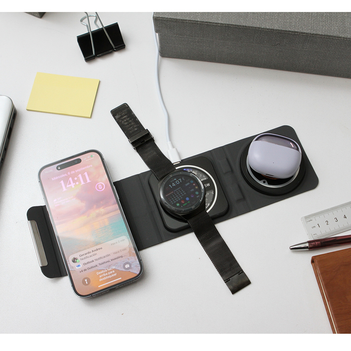 Cargador Sohar. - Cargador magnético para casa, oficina o viaje 3 en 1 plegable wireless de 15 w, material plástico ABS+PU, para celular, audífonos y reloj, carga rápida, multi función, compacto y fácil de transportar.