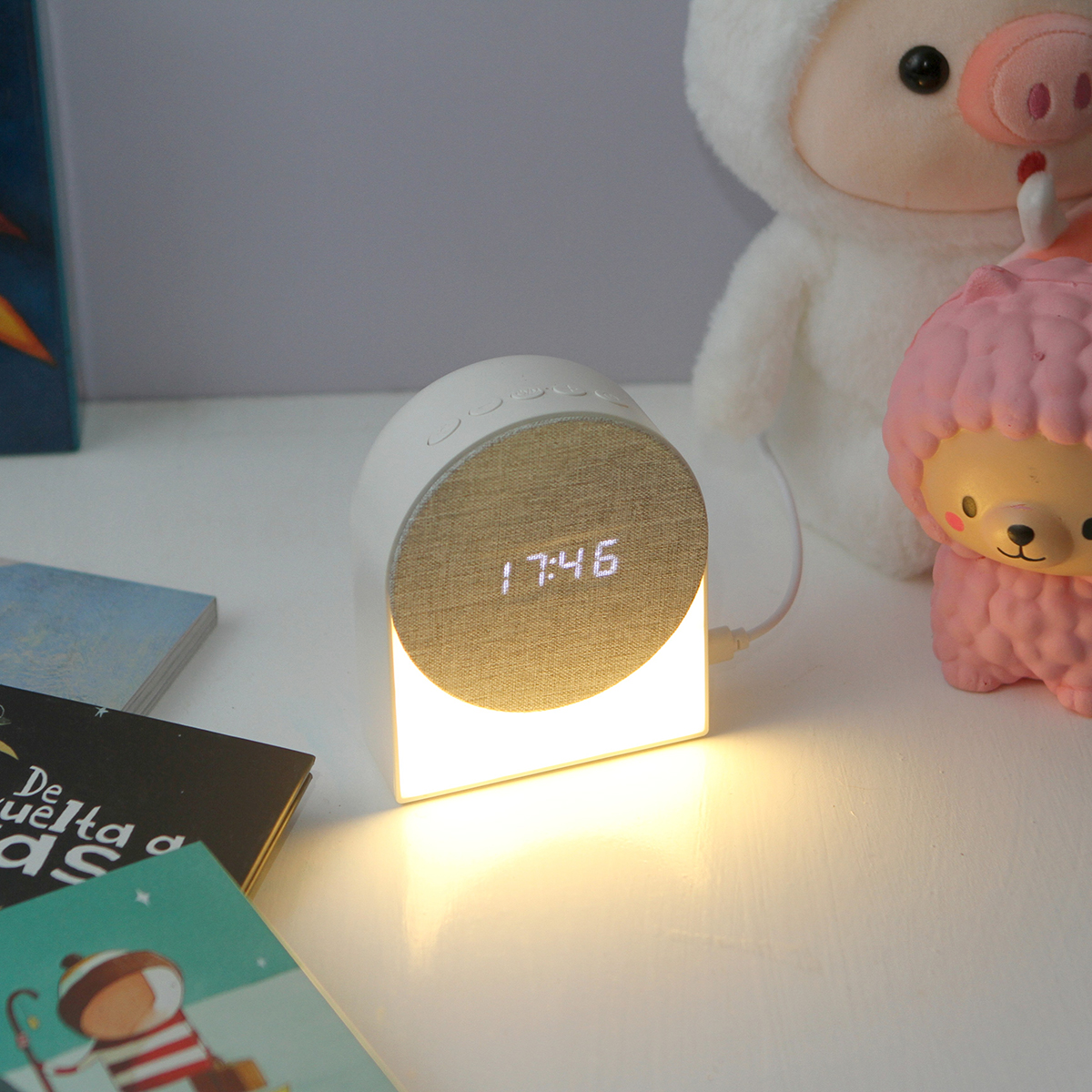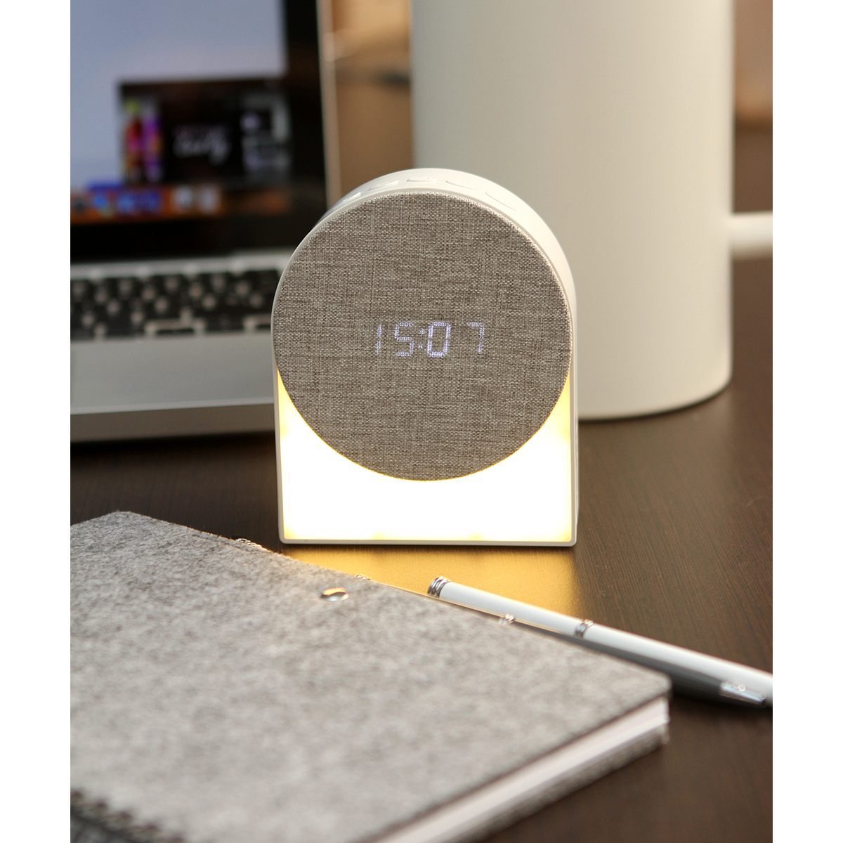 Bocina Seruci. - Bocina con conexión de sonido sin cables, con funciones de reloj, alarma, luz nocturna y ruido blanco. Diseño especial para casos de insomnio, cuenta con sonidos de descanso terapéutico predeterminados. Potencia de 3W y batería integrada de iones de litio.