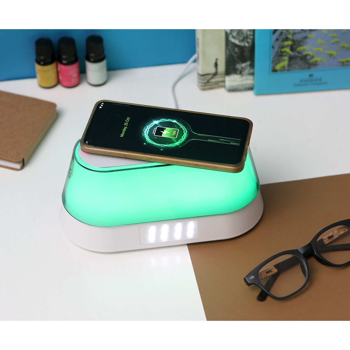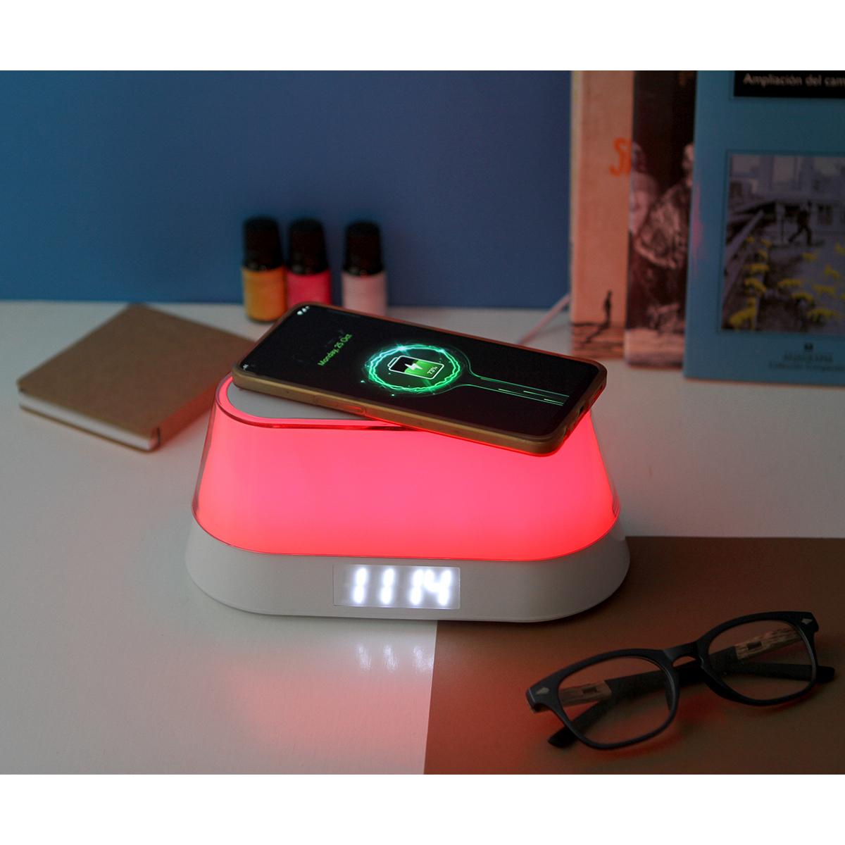 Bocina Canaglia. - Bocina multifunción de plástico con conexión de sonido sin cables, lámpara LED con efectos de colores, funciones de alarma y cargador inalámbrico. Potencia de altavoz de 3W, potencia de carga de hasta 15W.