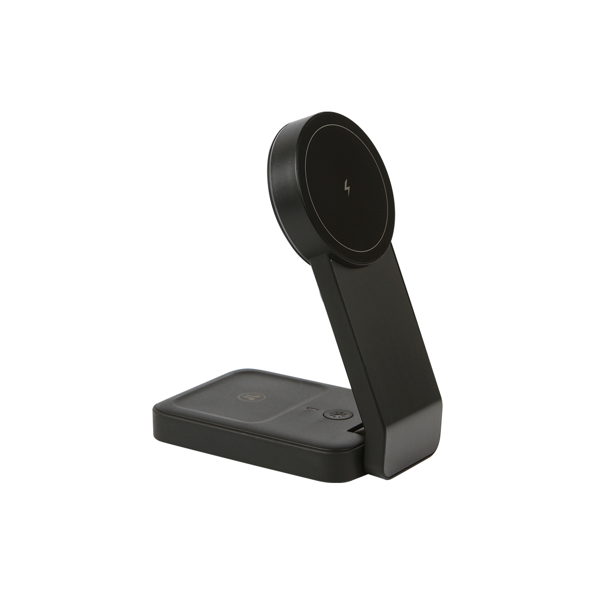 Cargador Alguer. - Cargador inalámbrico fabricado en plástico y aluminio plegable 4 en 1 ( carga celular, audífonos y reloj inteligente) con luz nocturna.