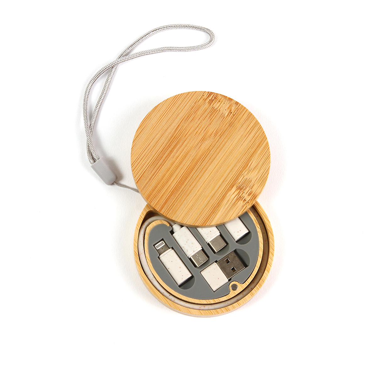 Set de cables Tartu. - Set ecológico de cables para conexión adaptadores para diferentes entradas (Tipo-C, USB y Lightning), cuentan con cubierta de fibra de trigo. Incluye estuche fabricado en madera de bambú con correa.