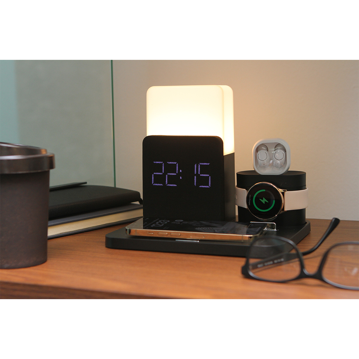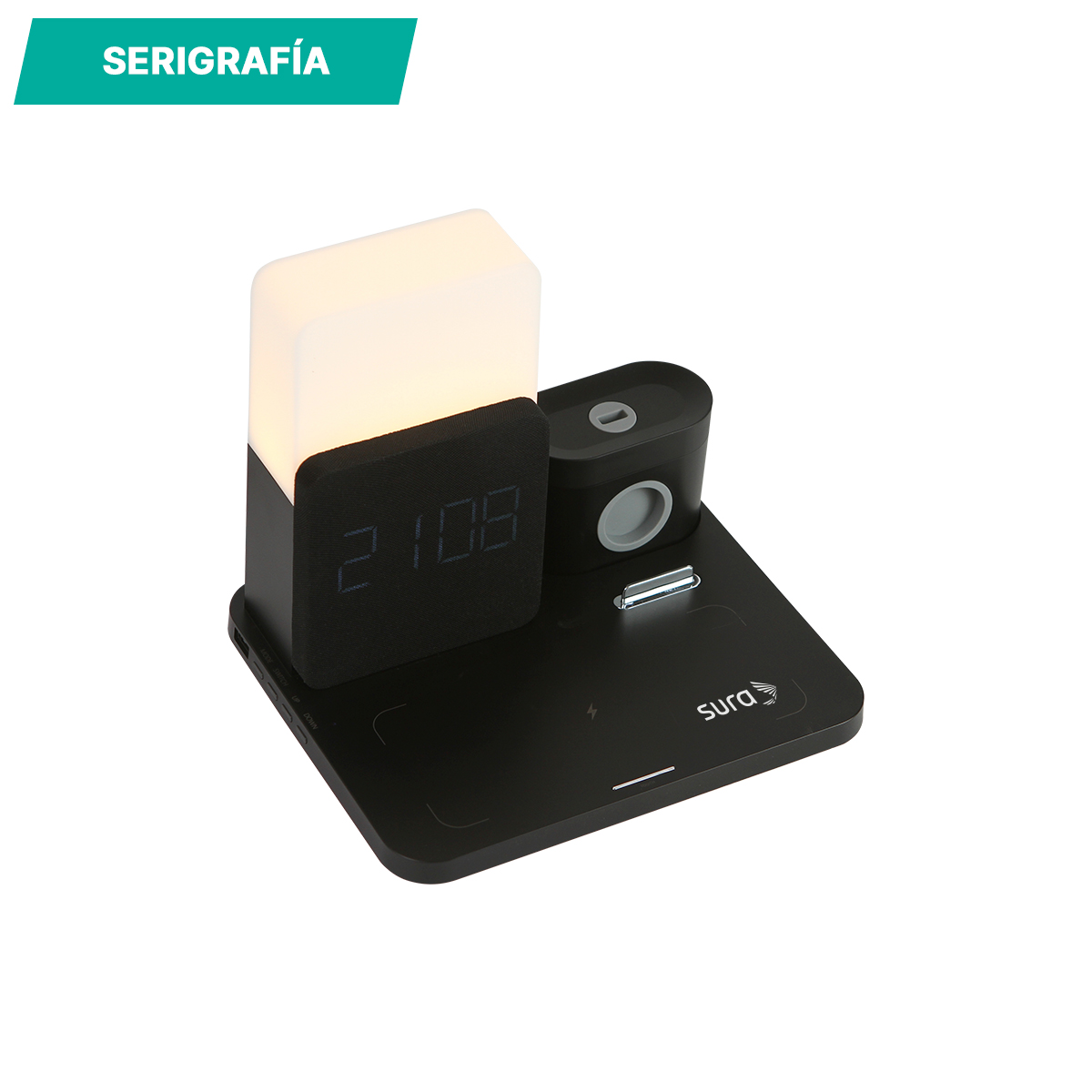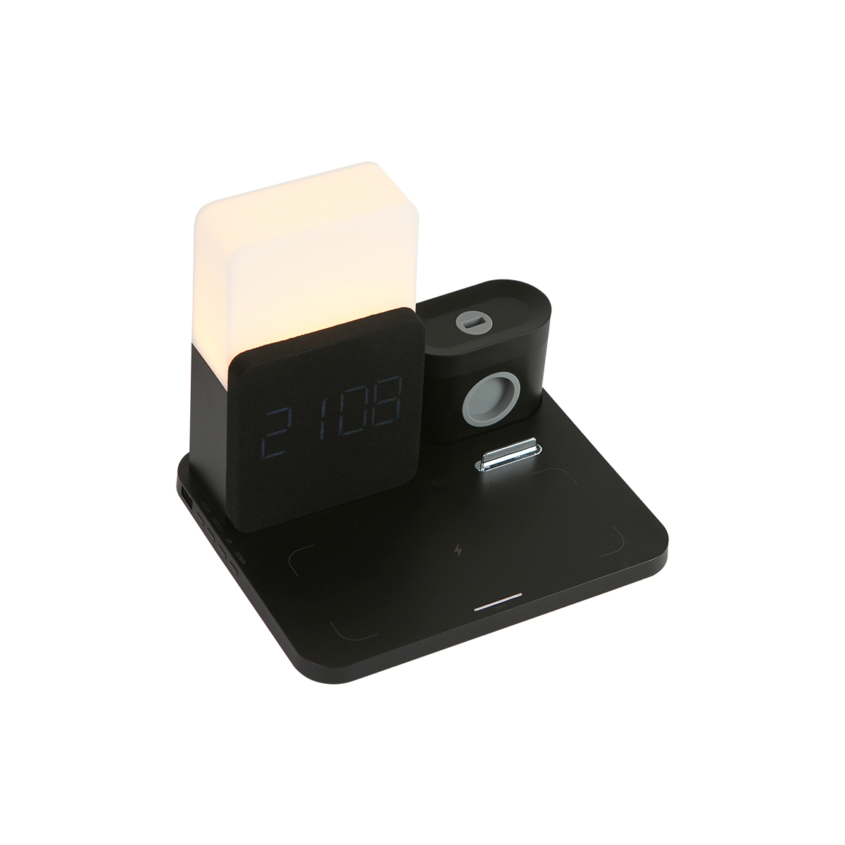 Cargador Donato. - Cargador inalámbrico con luz nocturna y potencia de hasta 15W. Incluye función de reloj con alarma. Cuenta con zonas de carga para audífonos inalámbricos, reloj inteligente y teléfono celular. Diseño ergonómico especializado para escritorio.