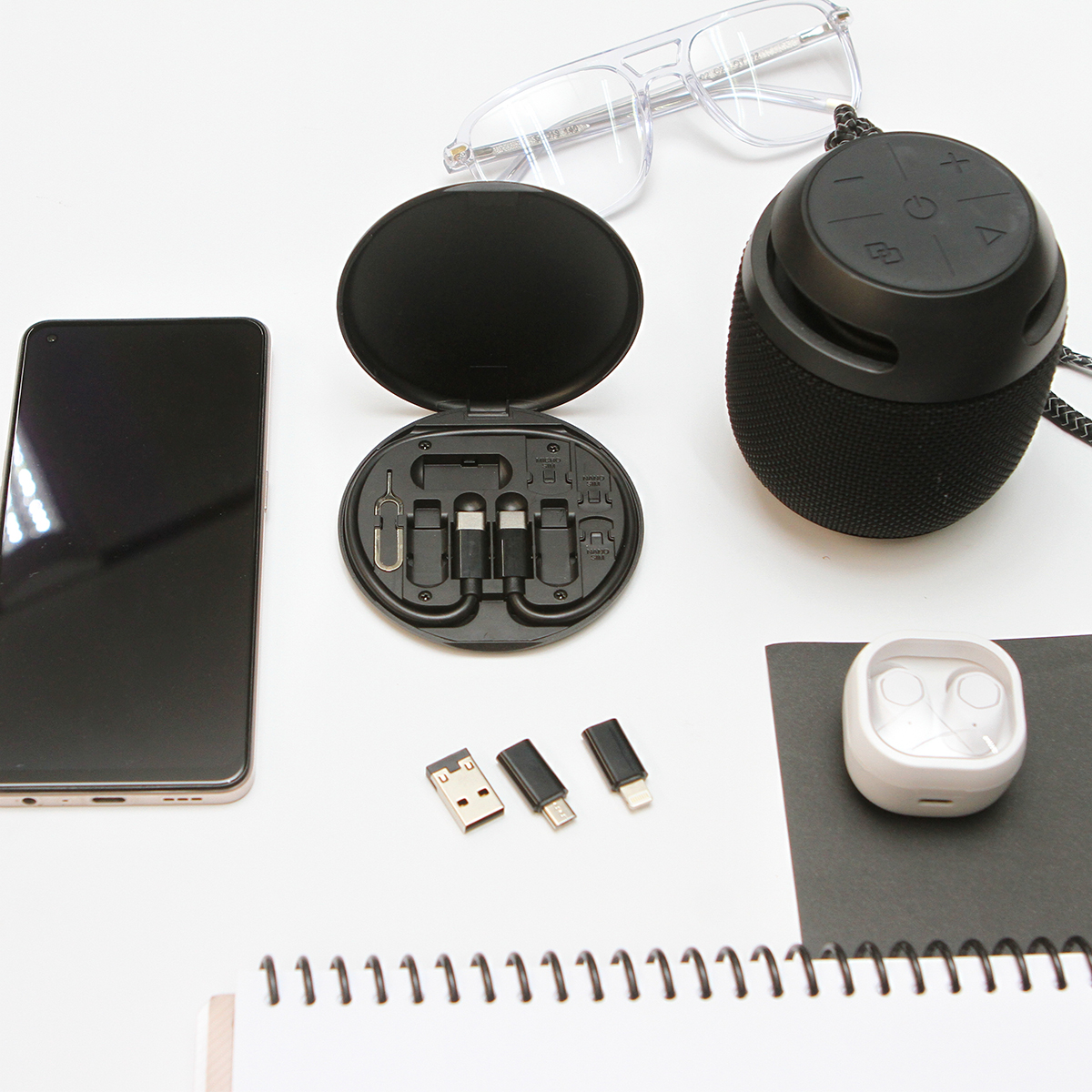 Estuche Giove. - Estuche liviano y portátil multifuncional para almacenamiento que ofrece una solución práctica para necesidades de carga y transferencia de datos, incluye: Cable USB C Macho - USB C Macho, con Adaptador USB A/Micro USB/Lightning con USB.