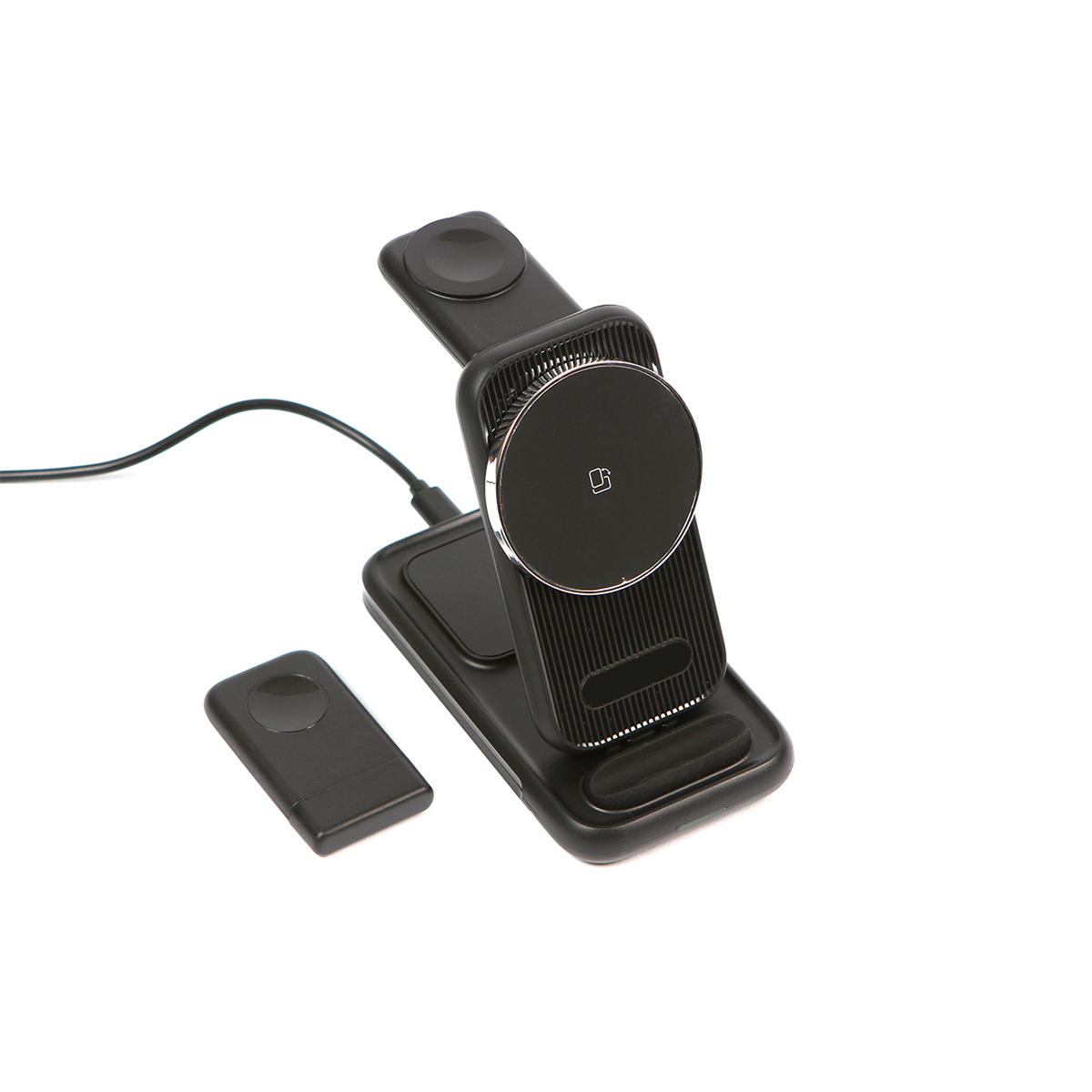 Cargador Blida. - Cargador inalámbrico 4 en 1. apto para cargar teléfono, reloj y audífonos inalámbricos. Capacidades de carga 5W/7,5W/10W/15W (MAX). Cuenta con salida USB tipo-C. Diseño plegable. Cuenta con protección contra sobrecarga y colocación de objetos extraños.