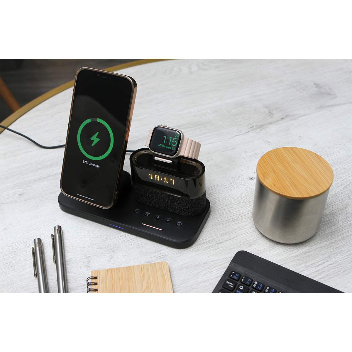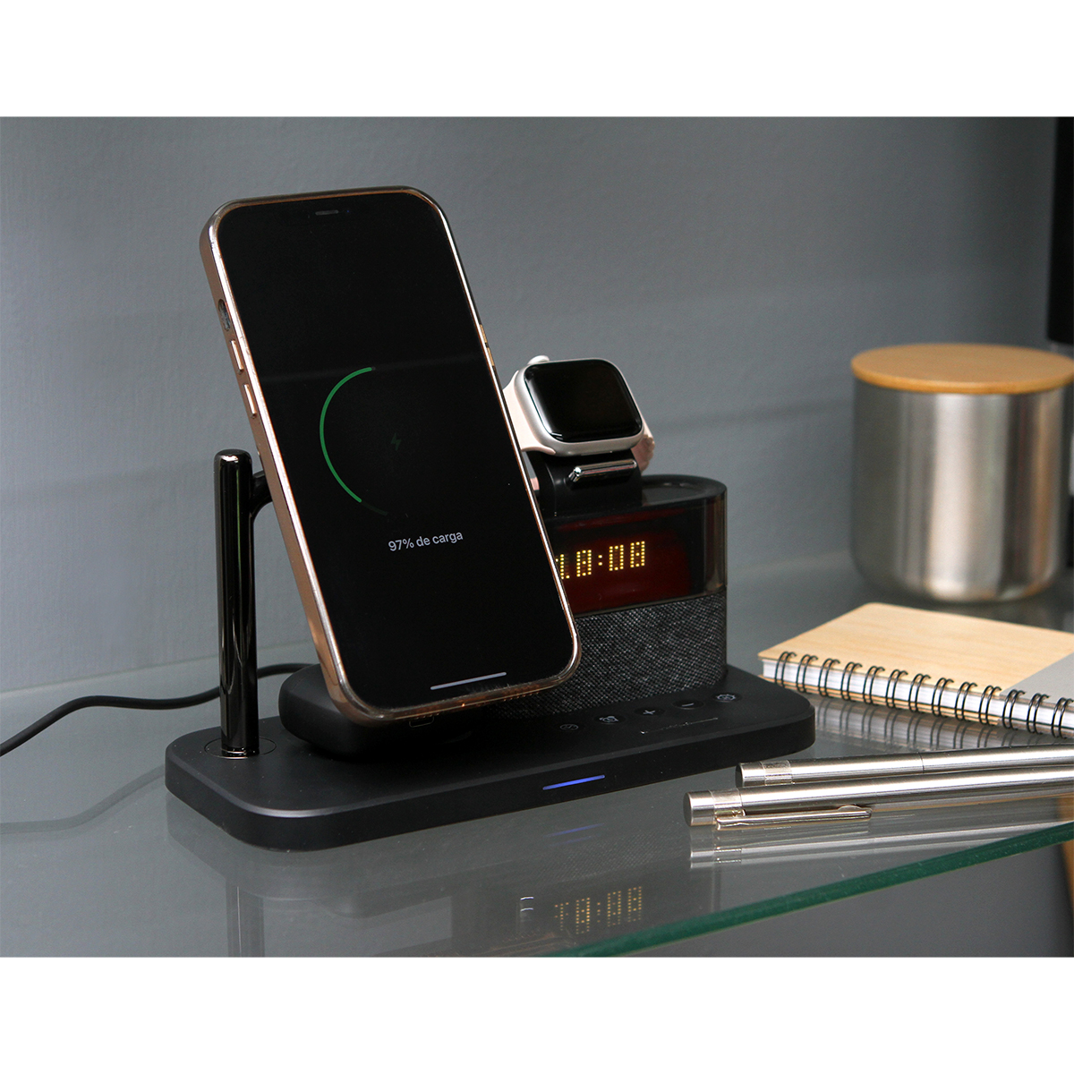 Cargador Provins. - Cargador con imán multifuncional para teléfono celular y audífonos inalámbricos. Con reloj y función de alarmas, incluye una lámpara de lectura. Diseño ergonómico especializado para escritorio y/o buró.