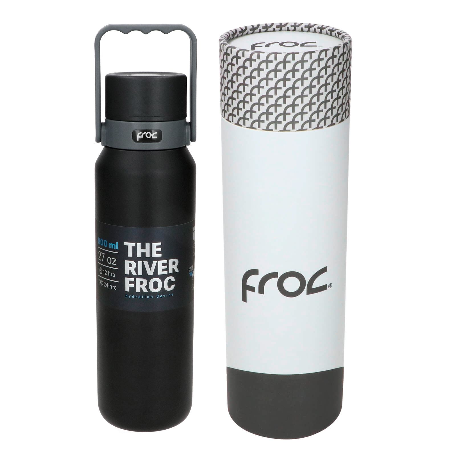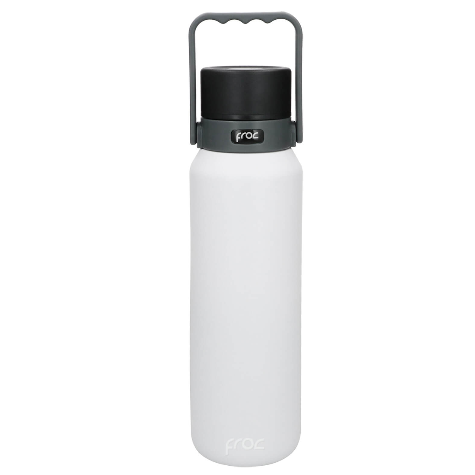 FROC Termo con doble pared de acero inoxidable insulado al vacio, base antiderrapante, tapa hermética con coladera metálica y mecanismo de apertura y cerrado facil.
