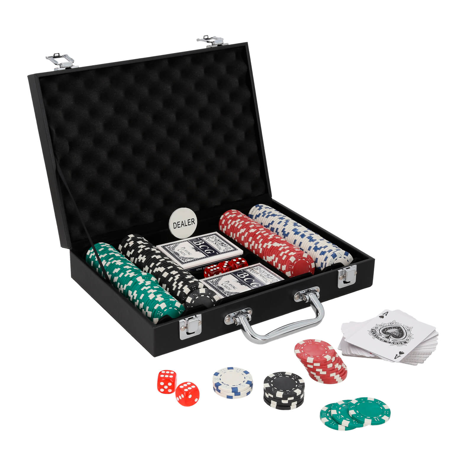 FULL Set de juego de poker con 2 barajas, 5 dados, 1 ficha dealer y 200 fichas de 4 diferentes colores.