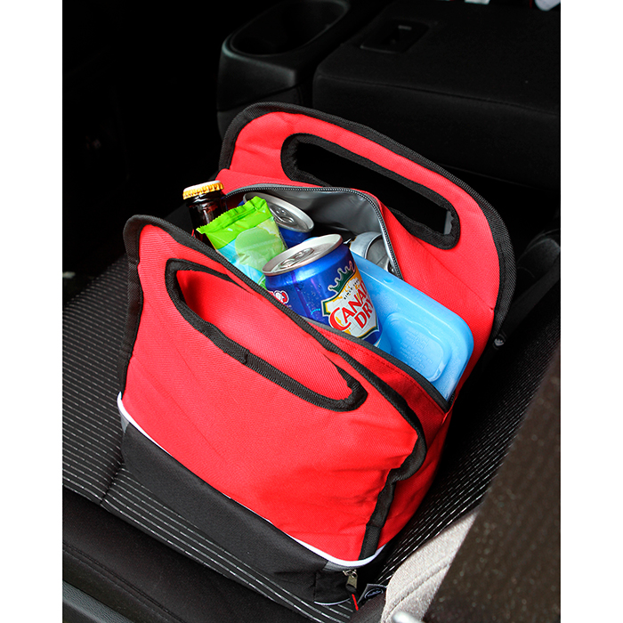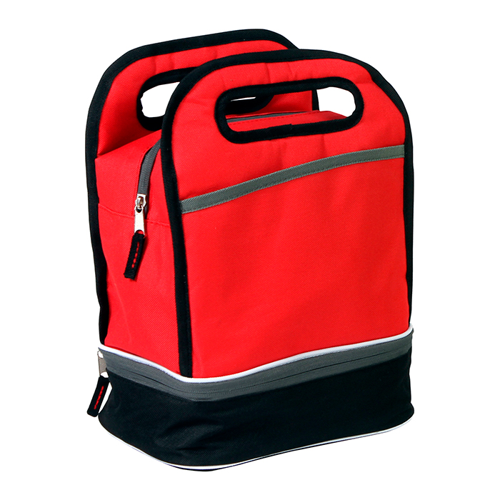 Lonchera Peva. - Lonchera fabricada en poliéster 600D con forro de PEVA y compartimento doble, asas en la parte superior, con detalles en color gris y negro, que le añaden un toque de personalidad y estilo.
