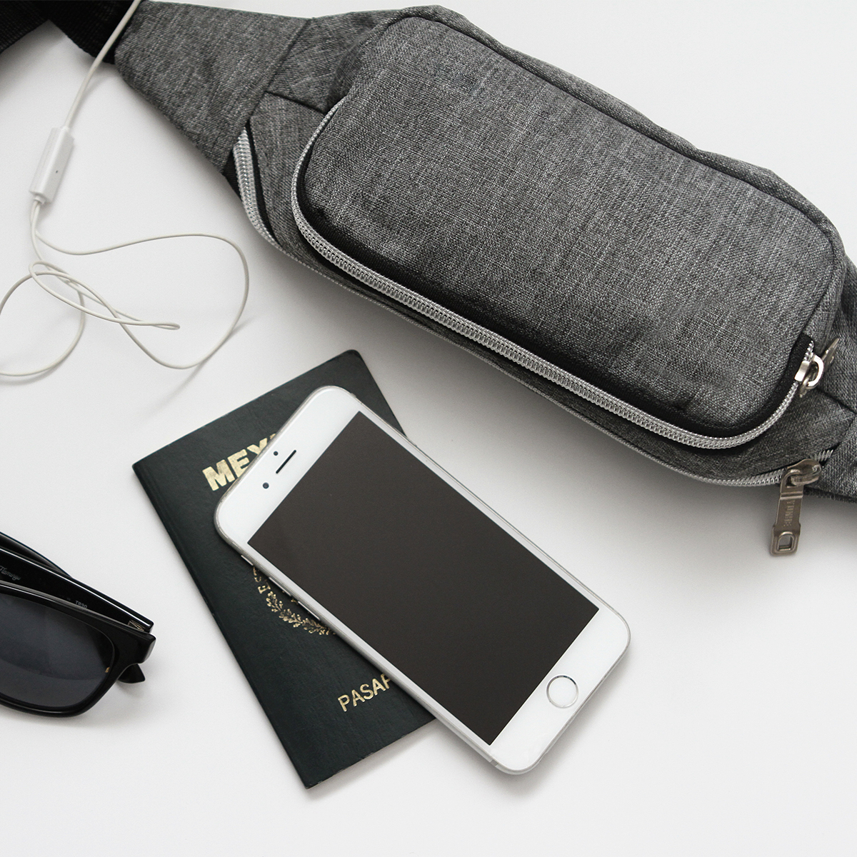 Cinturón Deportivo Padang. - Cangurera / Riñonera fabricada en poliéster, nylon y polipropileno; doble bolsa con cierre, correa ajustable y resistente con broche de seguridad. Excelente tamaño para guardar varios artículos como celular, monedas y audífonos.