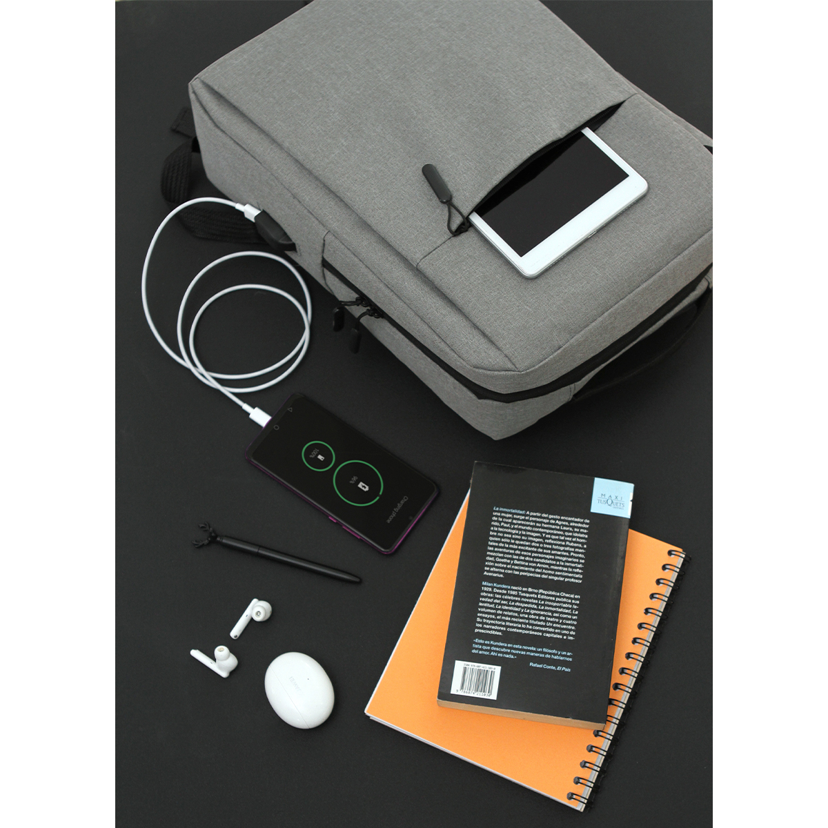 Backpack Rayyán. - Backpack fabricada en poliéster, incluye un amplio bolsillo frontal con cierre, que proporciona un espacio adicional para almacenar y organizar tus pertenencias, tirantes ajustables que permiten un ajuste personalizado y cómodo para adaptarse a tu altura y preferencias, puerto integrado para carga USB este puerto te permite conectar tu power bank o batería externa dentro de la mochila y cargar tus dispositivos electrónicos.