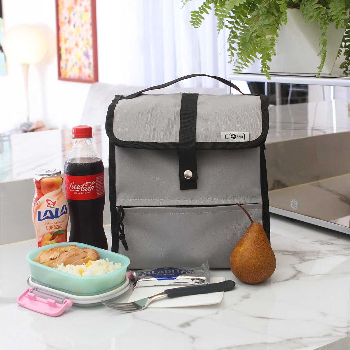 Lonchera de RPET Altái. - Lonchera térmica fabricada en poliéster reciclado (RPET), con 2 formas de cerrar, bolsillo frontal con cierre y asa superior. Esta bolsa es ideal para mantener tus alimentos frescos y en buen estado. El RPET es un material resistente y duradero que puede soportar el uso diario y el desgaste, lo que lo hace ideal para productos textiles. Además es sostenible porque utilizan materiales reciclados en su fabricación, lo que reduce la cantidad de residuos y disminuye el impacto ambiental.