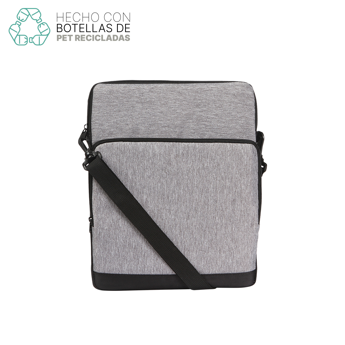 Bolsa de RPET Binago. - Bolsa multiusos fabricada en  poliéster reciclado (RPET) y polilona, lo que la hace ecoamigable, resistente y capaz de soportar el uso diario.  Adicional a su amplio compartimento  principal cuenta con un bolsillo frontal espacioso y bolsillos traseros de malla, perfectos para guardar objetos de uso frecuente o de fácil acceso.  Adicionalmente cuenta con una correa ajustable que puede retirarse y te permite llevarla cómodamente al hombro o cruzada en el cuerpo. El RPET es un material resistente y duradero que puede soportar el uso diario y el desgaste, lo que lo hace ideal para productos textiles. Además es sostenible porque utilizan materiales reciclados en su fabricación, lo que reduce la cantidad de residuos y disminuye el impacto ambiental.