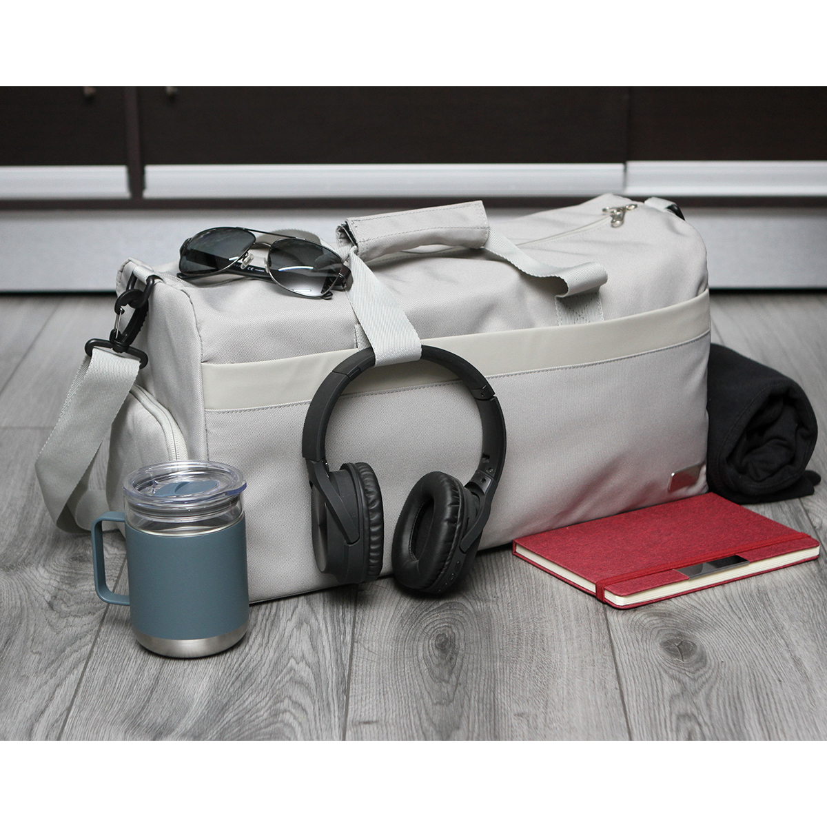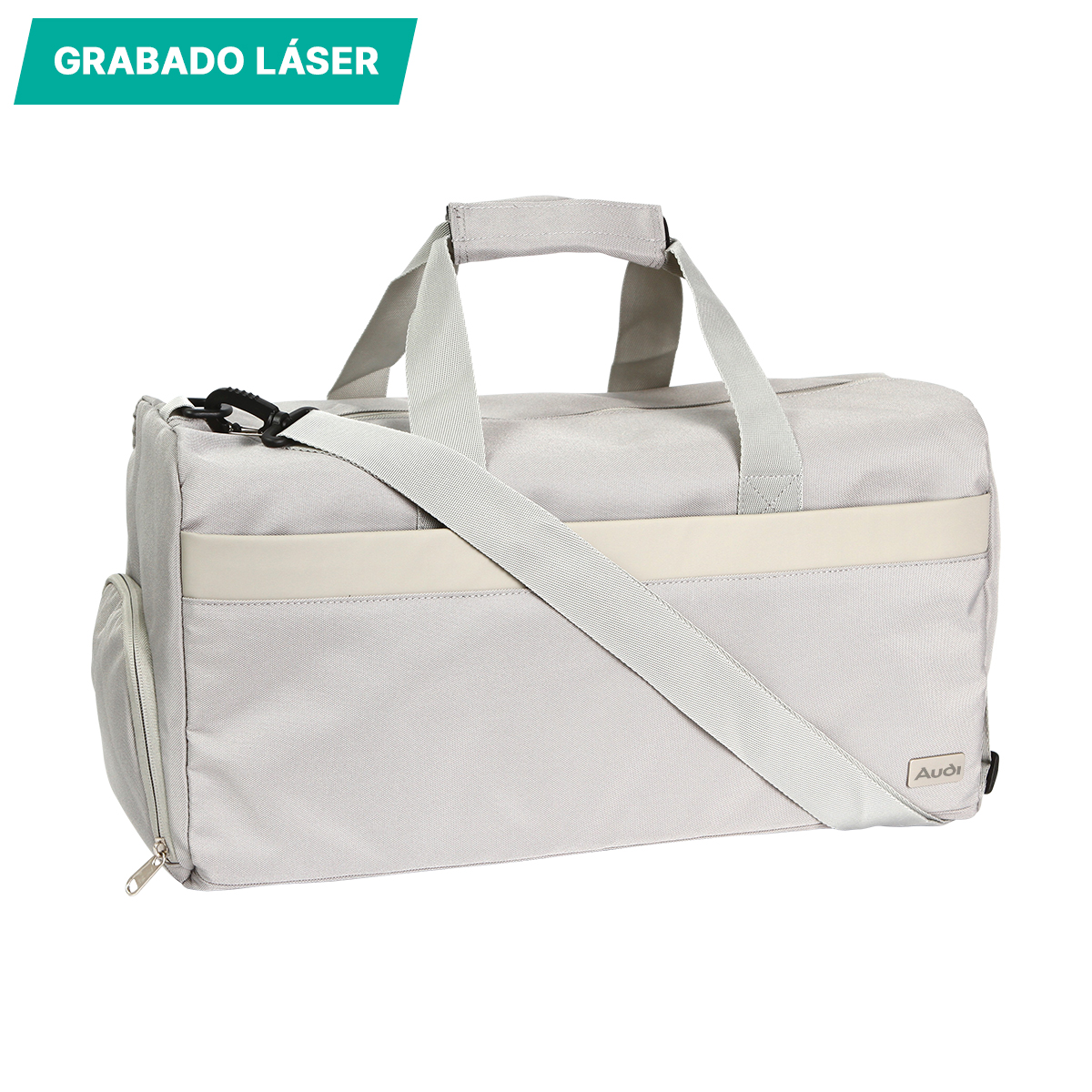 Maleta Suure. - Maleta de viaje premium, fabricada en cuero sintético (PU) 900D, forro 210D, cinta de PP de 1,5” y placa metálica para grabar logotipo. Cuenta con correa de hombro, asas y bolsa lateral.