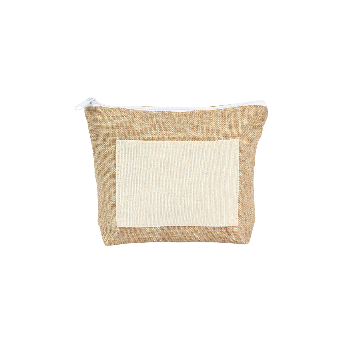 Cosmetiquera Ottava. - Bolsa cosmetiquera fabricada en algodón 10A y yute imitación (poliéster). Cuenta con cierre metálico y detalle de diseño cuadrado.