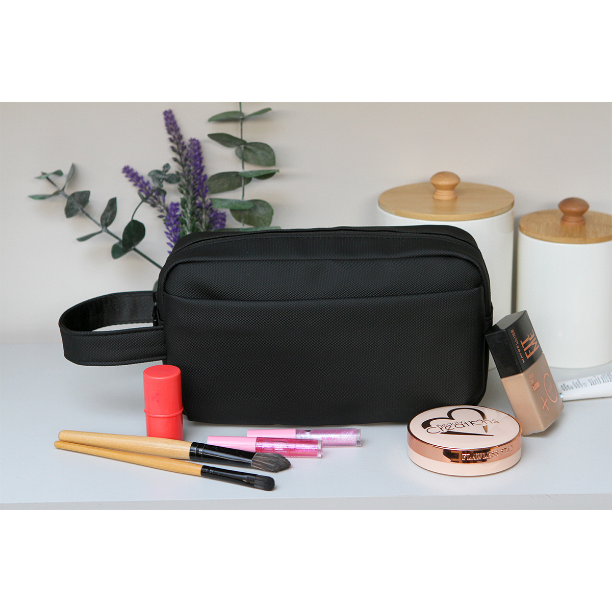 Cosmetiquera Tlemcen. - Cosmetiquera fabricada en tela tipo oxford con acabado a prueba de agua. Dentro incluye un forro tipo diamante. Con un compartimento principal con cierre y una agarradera lateral para su fácil manejo.