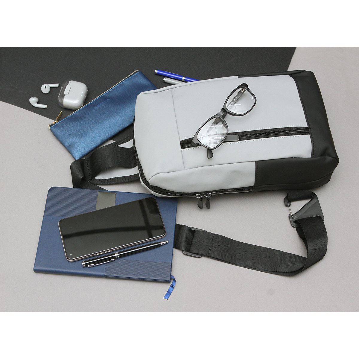 Mochila Anger. - Mochila tipo crossbody fabricada en poliéster con detalles en cuero sintético. Cuenta con un compartimento principal y otro frontal, ambos con cierre con correa de hombro ajustable para mayor comodidad.