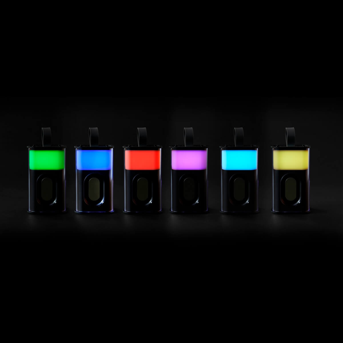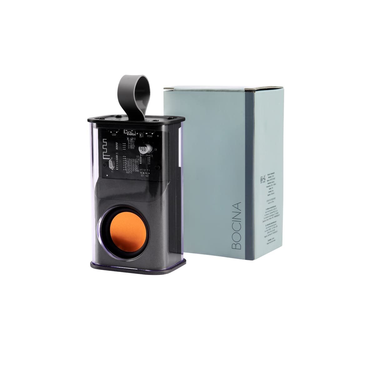BOCINA CIRCUIT - Bocina bluetooth recargable. Luz RGB con 7 efectos diferentes. Reproducción de música por 3 horas aproximadamente. Tiempo de carga 2-3 horas. Alcance de conexión de 10 metros. Batería de 500 mAh. Conexión tipo C. Incluye cable auxiliar y asa de silicón para transportarla fácilmente.