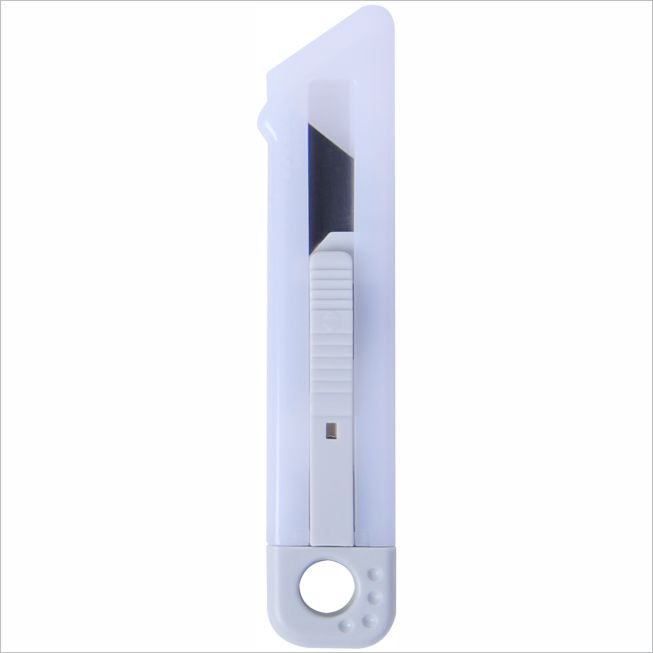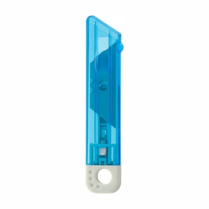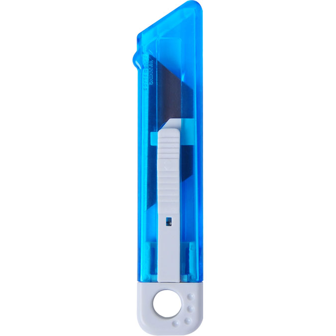Cuter Safe Cuter con cuerpo de plástico, disponible en blanco y azul claro. Mecanismo retráctil sin tope, para seguridad del usuario. Se entrega en bolsita individual de plástico.