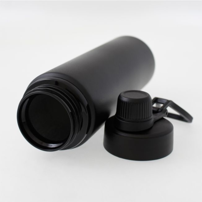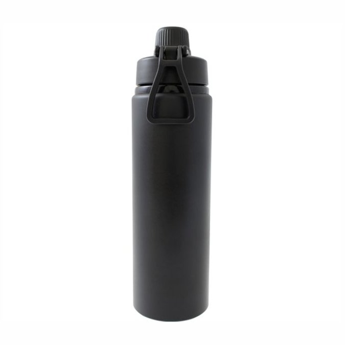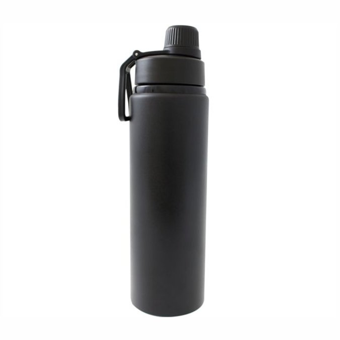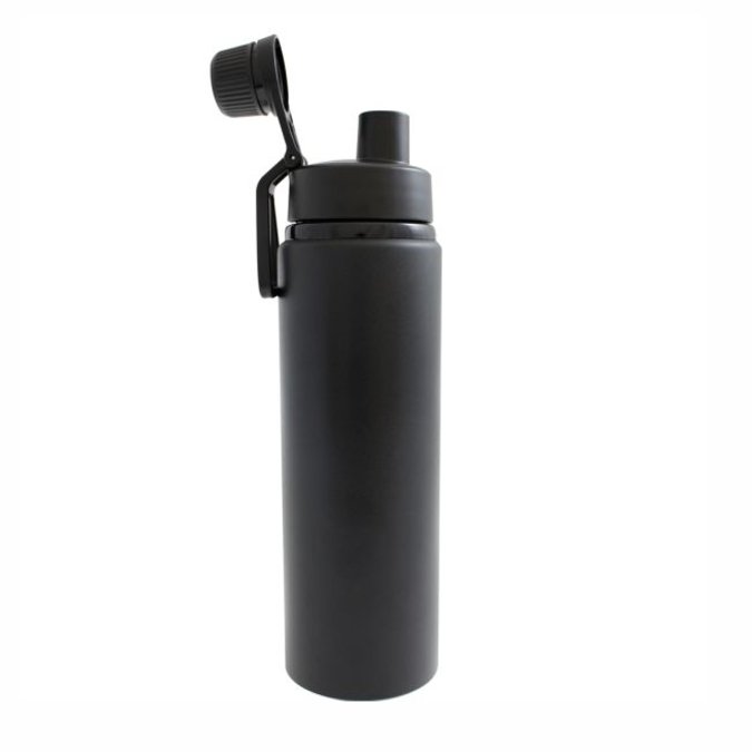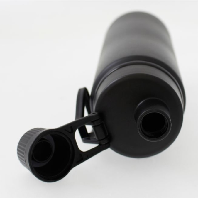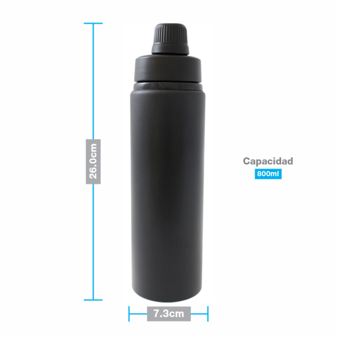 Ánfora Tanker Cilindro para agua de 800 ml. Acabado negro mate. Un producto que combina funcionalidad y diseño. Ultra ligero, gracias a su composición de aluminio. Producto Libre de BPA. La tapa de plástico cuenta con agarradera para su fácil transportación. Está diseñada con doble boca con cierre de rosca; la de mayor tamaño te permitirá llenar tu ánfora con la bebida de tu elección y facilitará el proceso de lavado. La boquilla pequeña lleva la rosca en el interior, por lo que hará mucho más cómoda la experiencia al beber, además de garantizar un cierre perfecto que evitará derrames. Olvídate de las botellas desechables y contribuye con un mundo más limpio. Un producto ideal para el gimnasio, la oficina, la escuela y para tus viajes. Se entrega en caja de cartón individual. Lavar antes de usar.