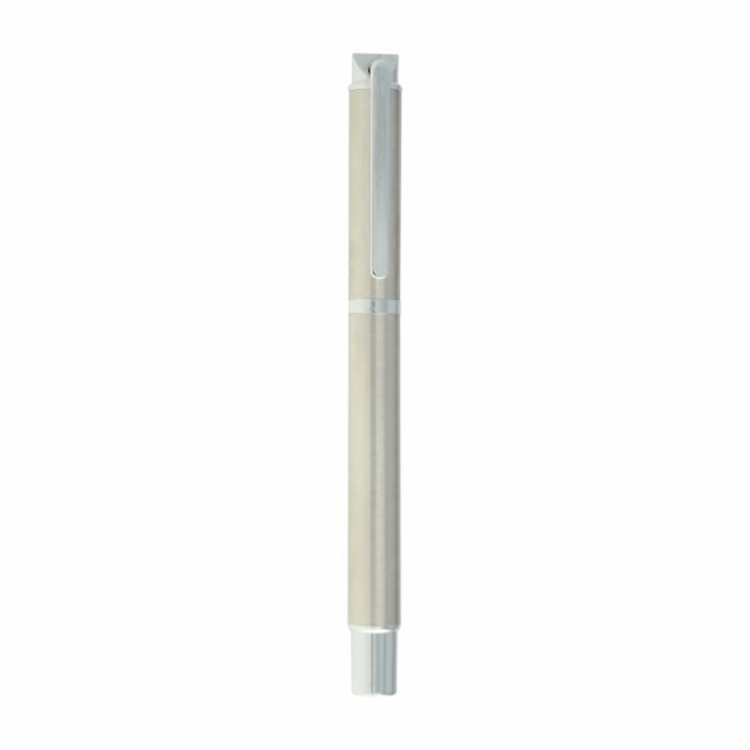 Aria Bolígrafo metálico con tapón que cierra a presión. Detalles color cromo. Salvo el acero, el bolígrafo negro y azul tienen una suave textura ahulada. Escritura de alto desempeño debido a su repuesto japonés tipo roller (a elegir entre tinta negra o azul). Incluye estuche individual.