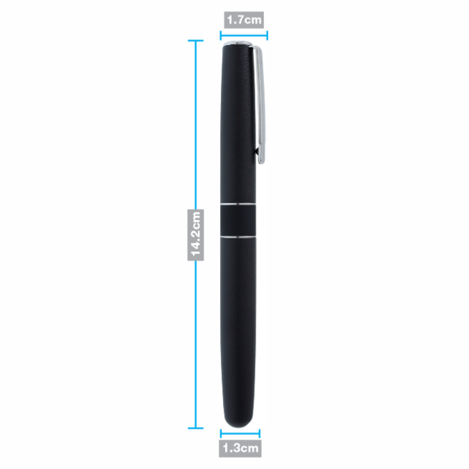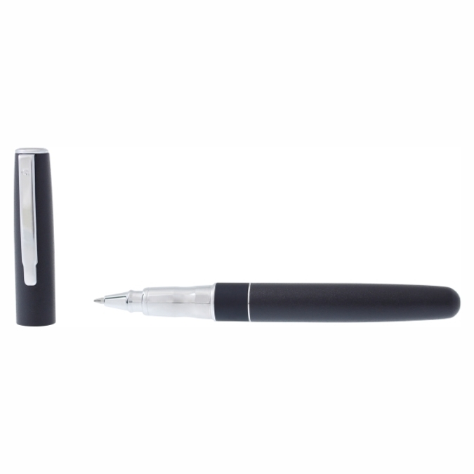 Dakar Rock Bolígrafo metálico con tapón que cierra a presión. Detalles color cromo. Acabado negro mate con textura tipo roca que permite grabados de mayor profundidad. Escritura de alto desempeño debido a su repuesto japonés tipo roller (a elegir entre tinta negra o azul). Incluye estuche individual.