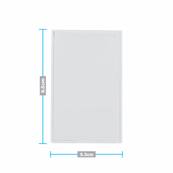 MATERIAL: PLASTICO MEDIDAS: Alto: 8.5 cm. Ancho: 5.3 cm. Fondo: 0.6 cm. IMPRESION: Serigrafía MED. EMPAQUE: Largo de la caja: 31.5 cm. Ancho de la caja: 20 cm. Alto de la caja: 20 cm. PESO EMPAQUE: 10 kg. PIEZAS EMPAQUE: 300 Pzas.