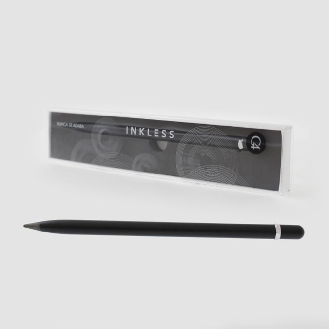 Infinity (Inkless) Bolígrafo ecológico que escribe sin tinta, por lo que nunca se termina. Disponible en acero, y negro mate con acabado rock (Texturizado y súper resistente). El trazo gris simula la línea de un lápiz. No deja manchas y es posible borrarlo con una goma regular. Incluye estuche individual.