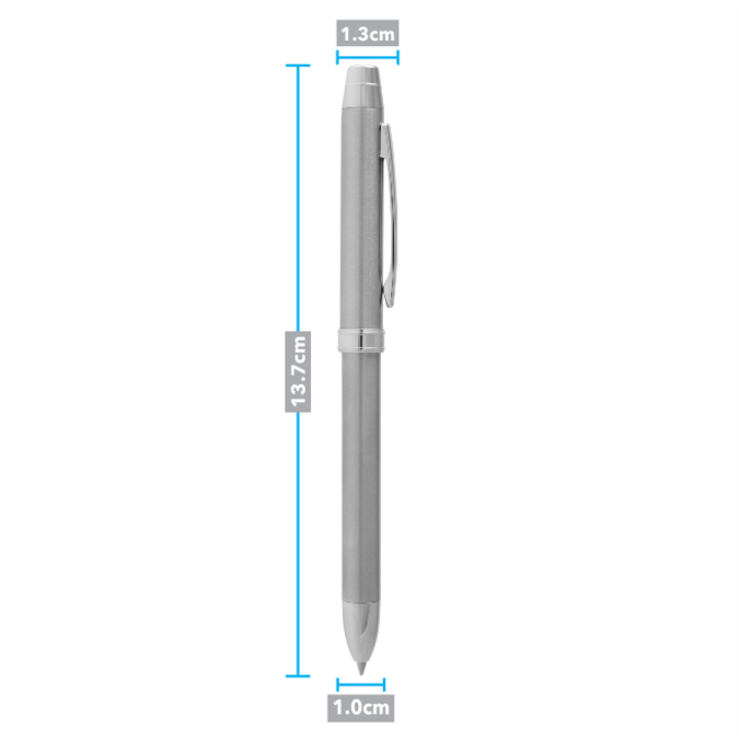 Insignia Acero (SS) Bolígrafo metálico multifuncional de acero inoxidable. Mecanismo de giro sin fin. Tinta negra, Tinta roja y Lapicero. Pequeño borrador en la parte superior cubierto con tapón de rosca. Elegante, discreto y ligero. Tintas de excelente desempeño.