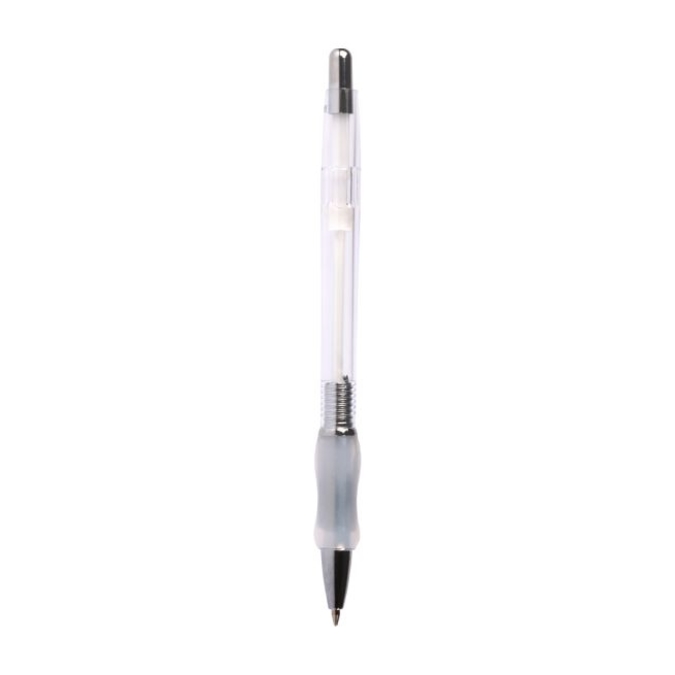 Jello Silicon Bolígrafo de plástico en colores translúcidos. Cuenta con un grip de silicón grado quirúrgico para mayor comodidad en la escritura, que además evita deformaciones con el tiempo y no permite cambio de coloración. Mecanismo retráctil. Tinta Negra.